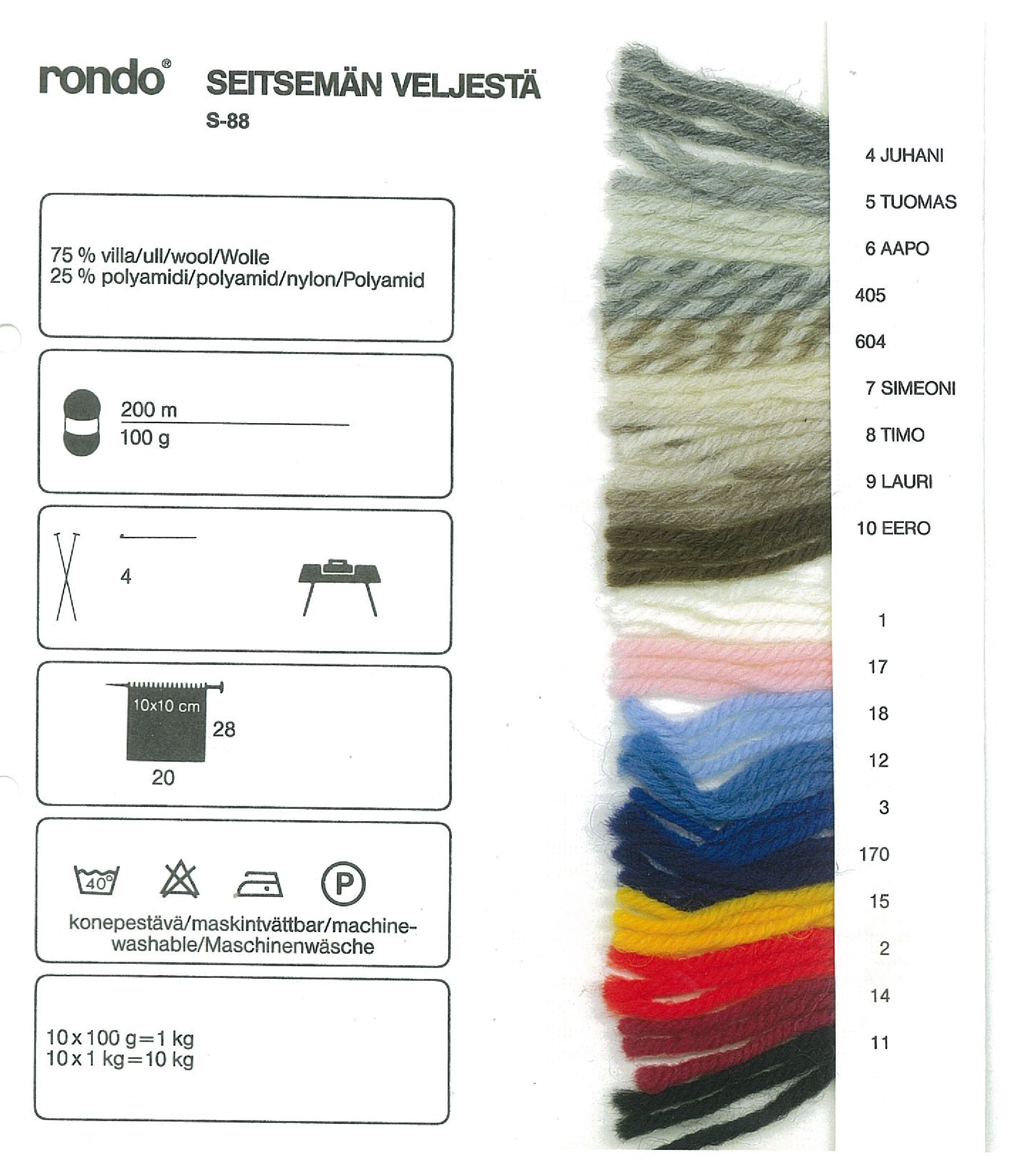 7 Veljestä -lankabrändi on kasvanut kokonaiseksi tuoteperheeksi, joka sisältää nykyään yksi- ja monivärisiä lankoja sekä metallinhohtoisia vaihtoehtoja. Kevään 2022 lankakartassa on 30 sävyä yksivärisestä 7 Veljeksestä sekä monivärisiä ja metallinhohtoa sisältäviä vaihtoehtoja yhteensä 25. Jos 7 Veljeksestä ei ole tullut aivan villalangan synonyymia, niin läheltä liippaa.