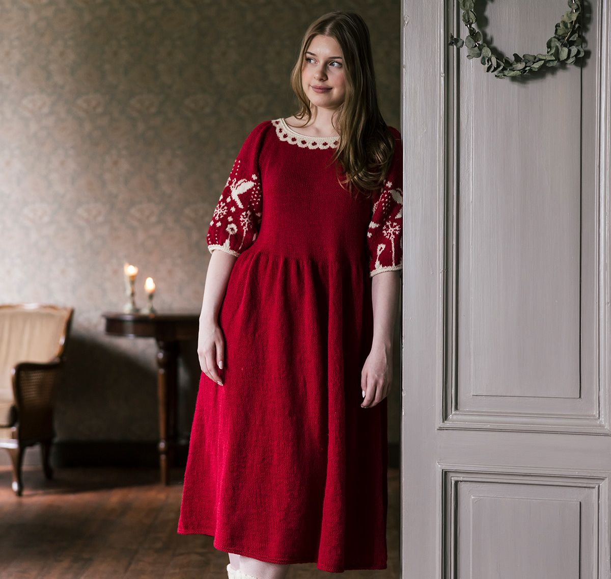 Mekon suloiset yksityiskohdat, kuten kirjoneulekuviot hihassa ja pääntiellä sekä vyötärön lempeä rypytys huokuvat vanhan ajan romanttista eleganssia. Kaunis mekko on täynnä lämpöä ja tunnetta.