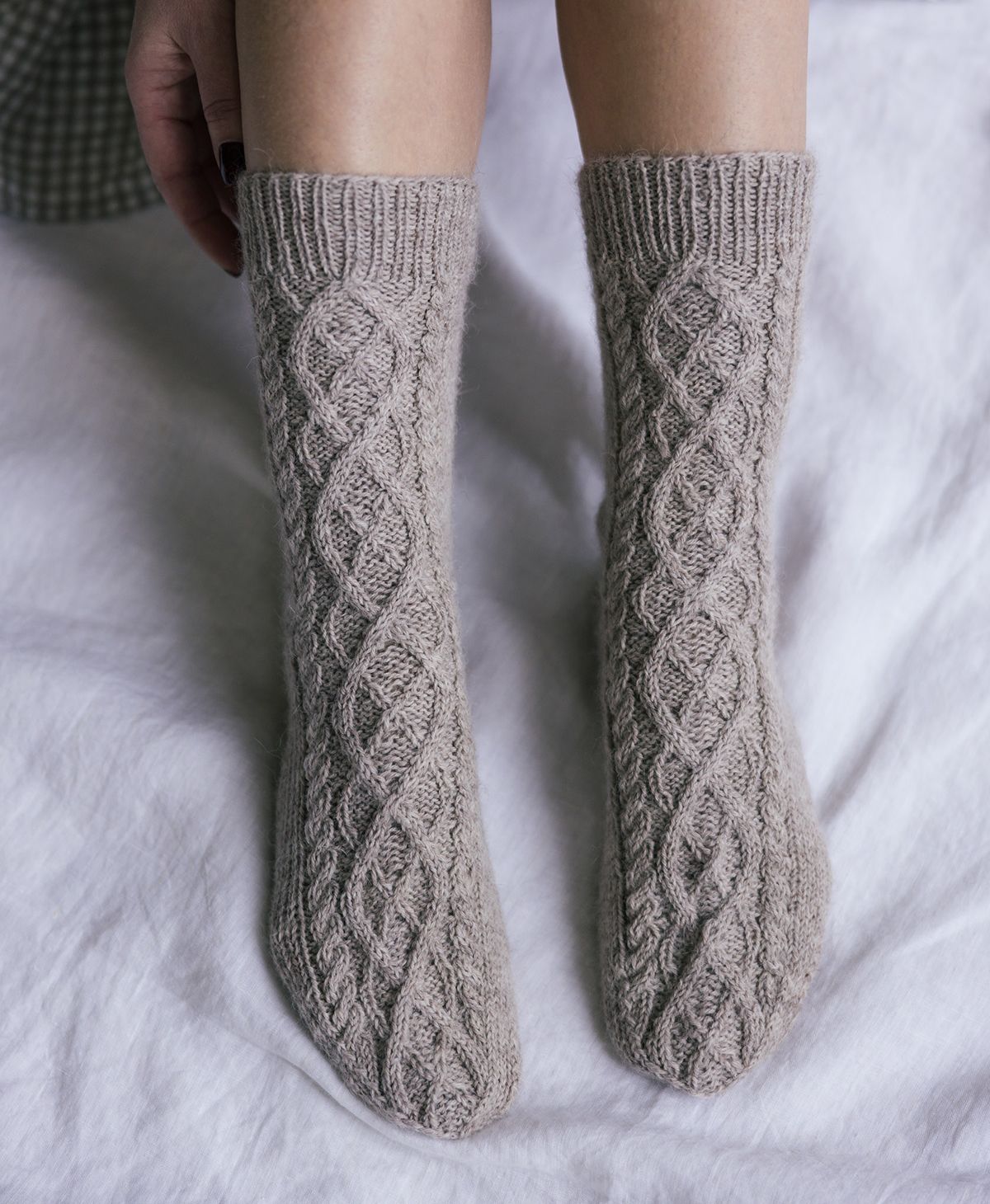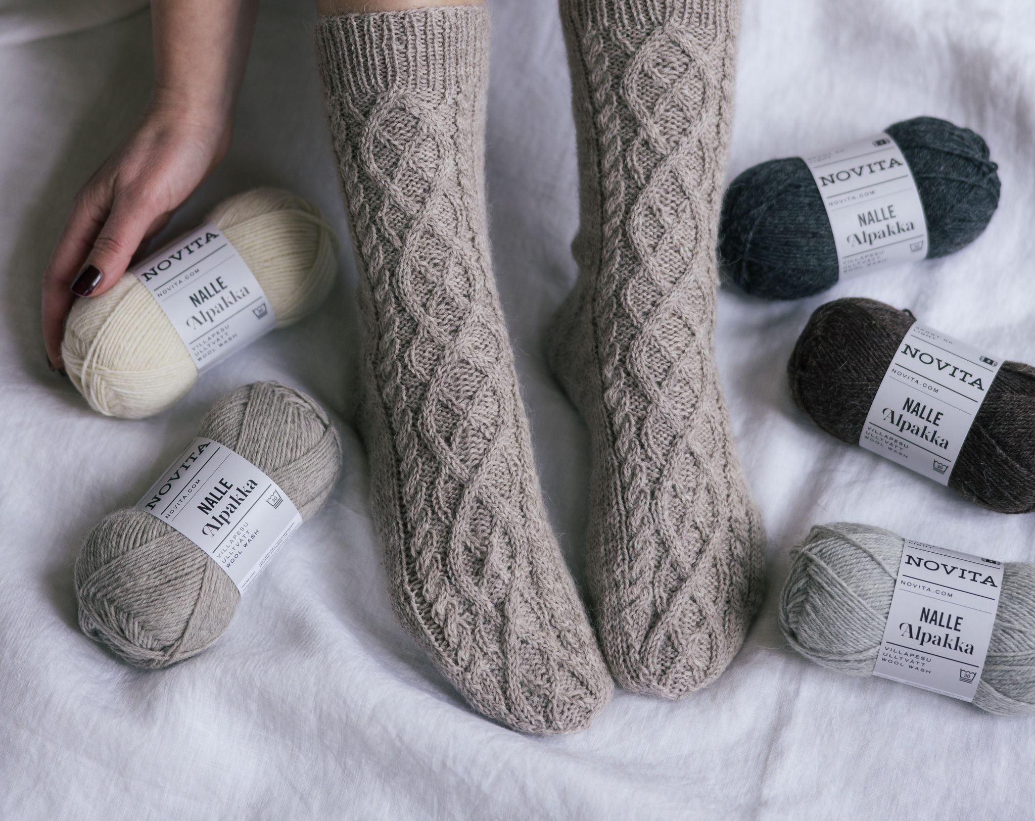 Ronja Hakalehdon suunnittelemien Koski-palmikkosukkien kaunis kuvio jatkuu sukan varresta terään. Novita Nalle Alpakka –langasta neulotut sukat mahtuvat hyvin myös talvikenkiin. Ohje on tehty koolle 38/39.