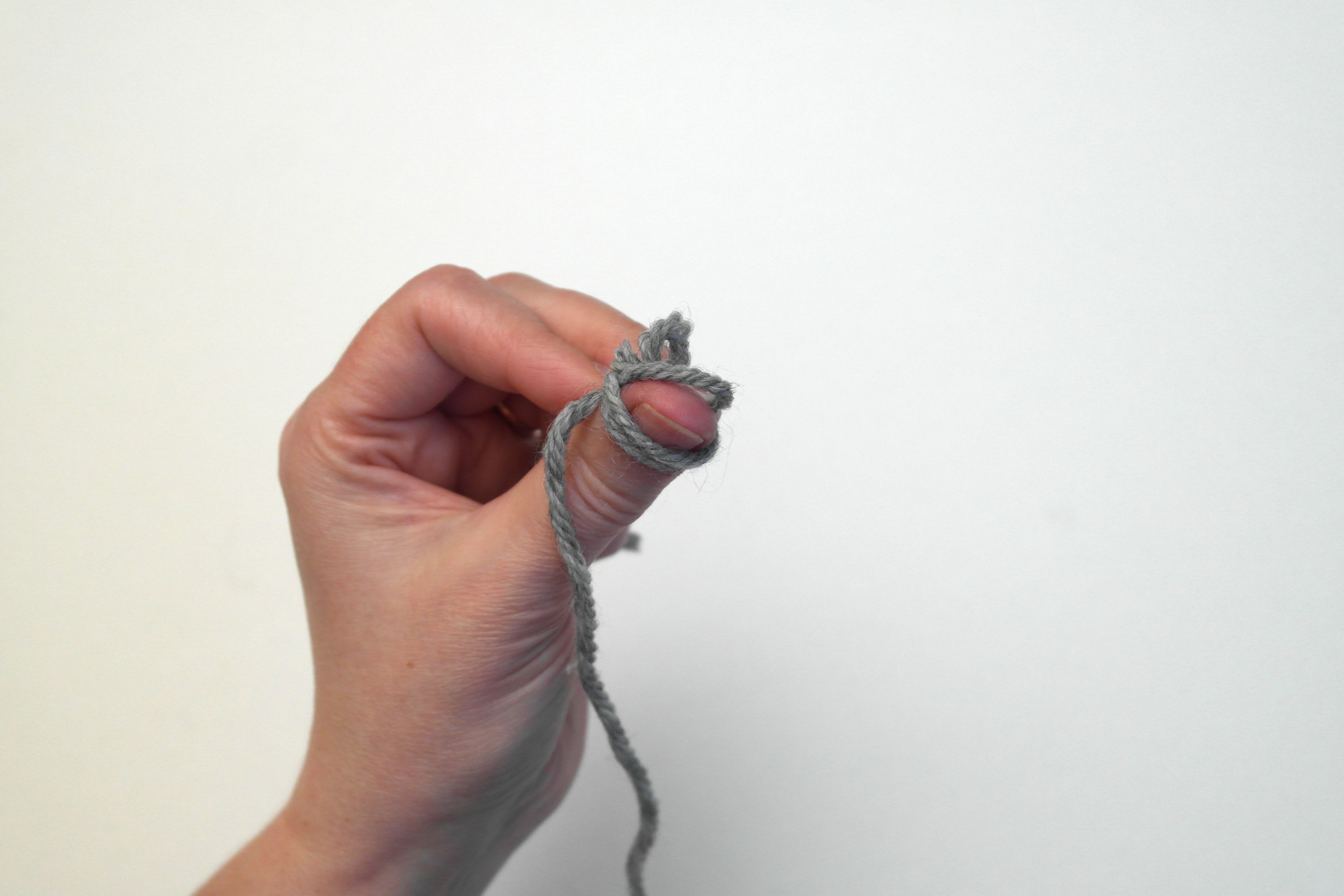 Peukalolla on nyt kolme silmukkaa ja neulalta kulkeva lanka. Nyt aloitussilmukat ovat valmiit aloitusnauhan ompelemiseen.