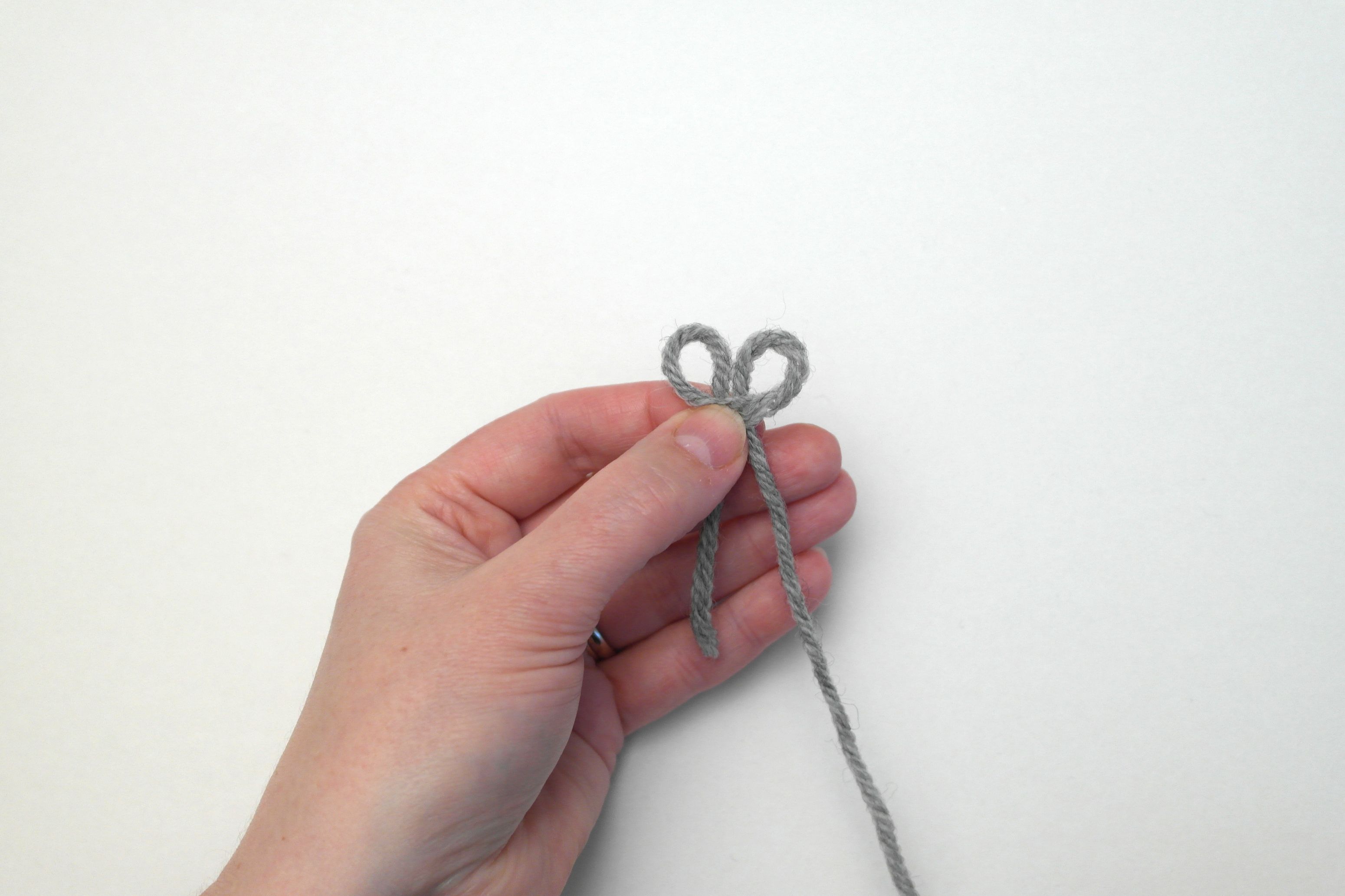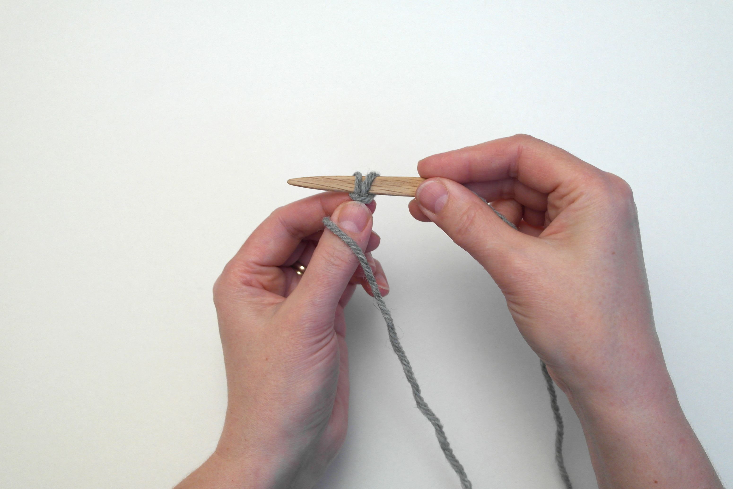 Leikkaa sopivan mittainen lanka ja pujota se kinnasneulaan. Taita langan loppupäähän kaksi lankalenkkiä kuvan mukaisesti.