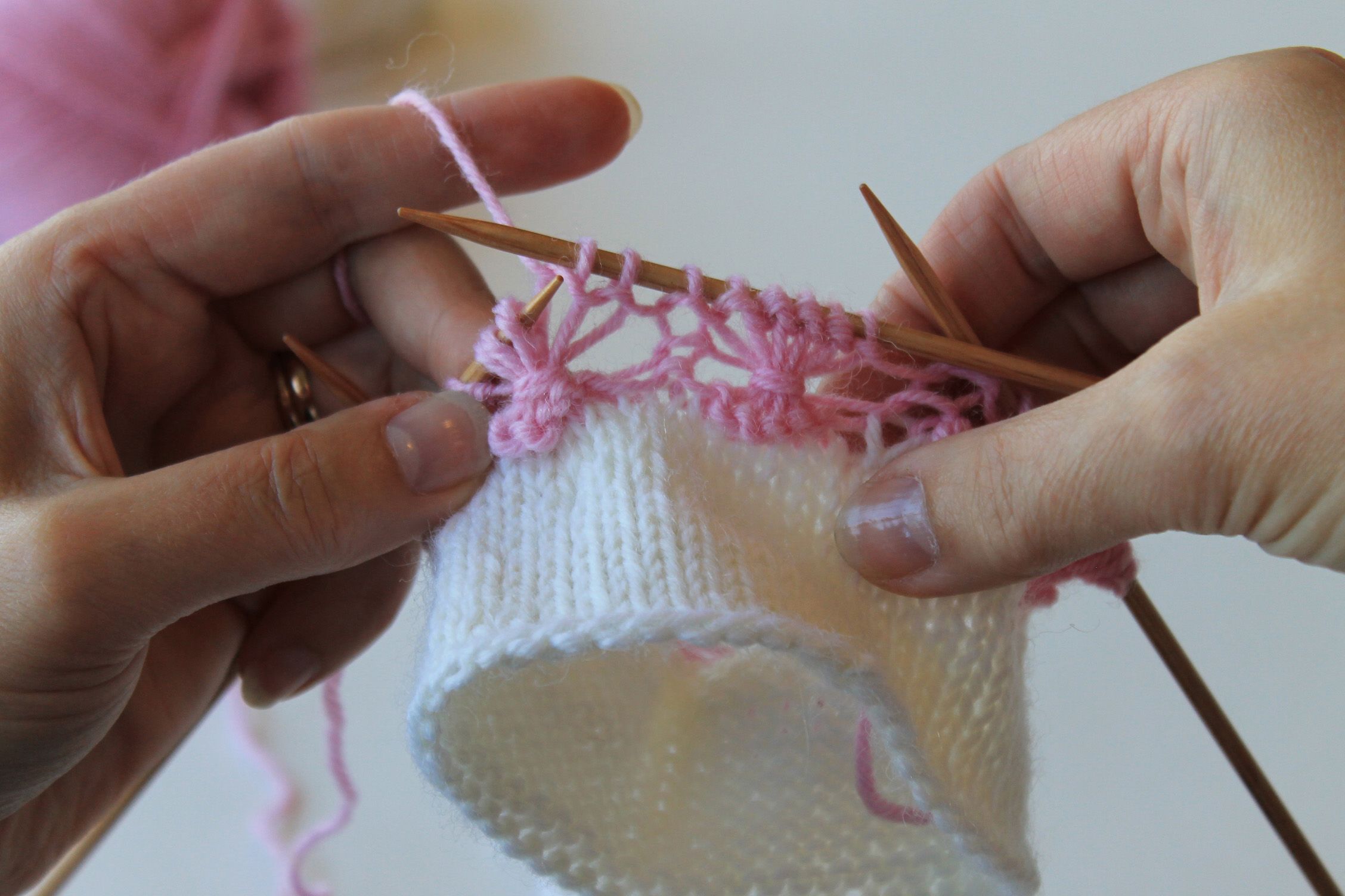 Jatka neulomista ohjeen mukaan. Aseta lopuksi kukkien keskelle kieputetut lankalenkit kulkemaan aivan kukkien keskellä.