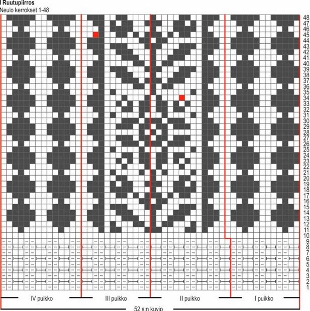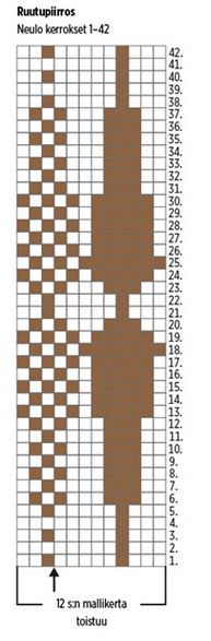 Aloita kirjoneule I ruutupiirroksen 11. kerrokselta ja neulo 52 s:n kuvio. Neulo ruutupiirroksen kerrokset 12–48.