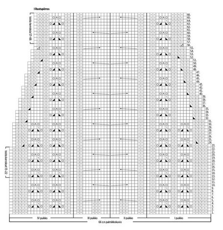 Huomaa, että isomman pohkeenleveyden kaaviossa puikolle I ja IV lisätään yhdet silmukat 5. kerroksella.