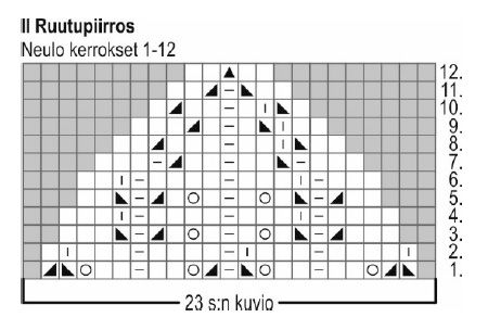 Jatka kummassakin koossa kirjoneuletta III ruudun 5. kerrokselta. Neulo ruutupiirroksen kerrokset 6–36.