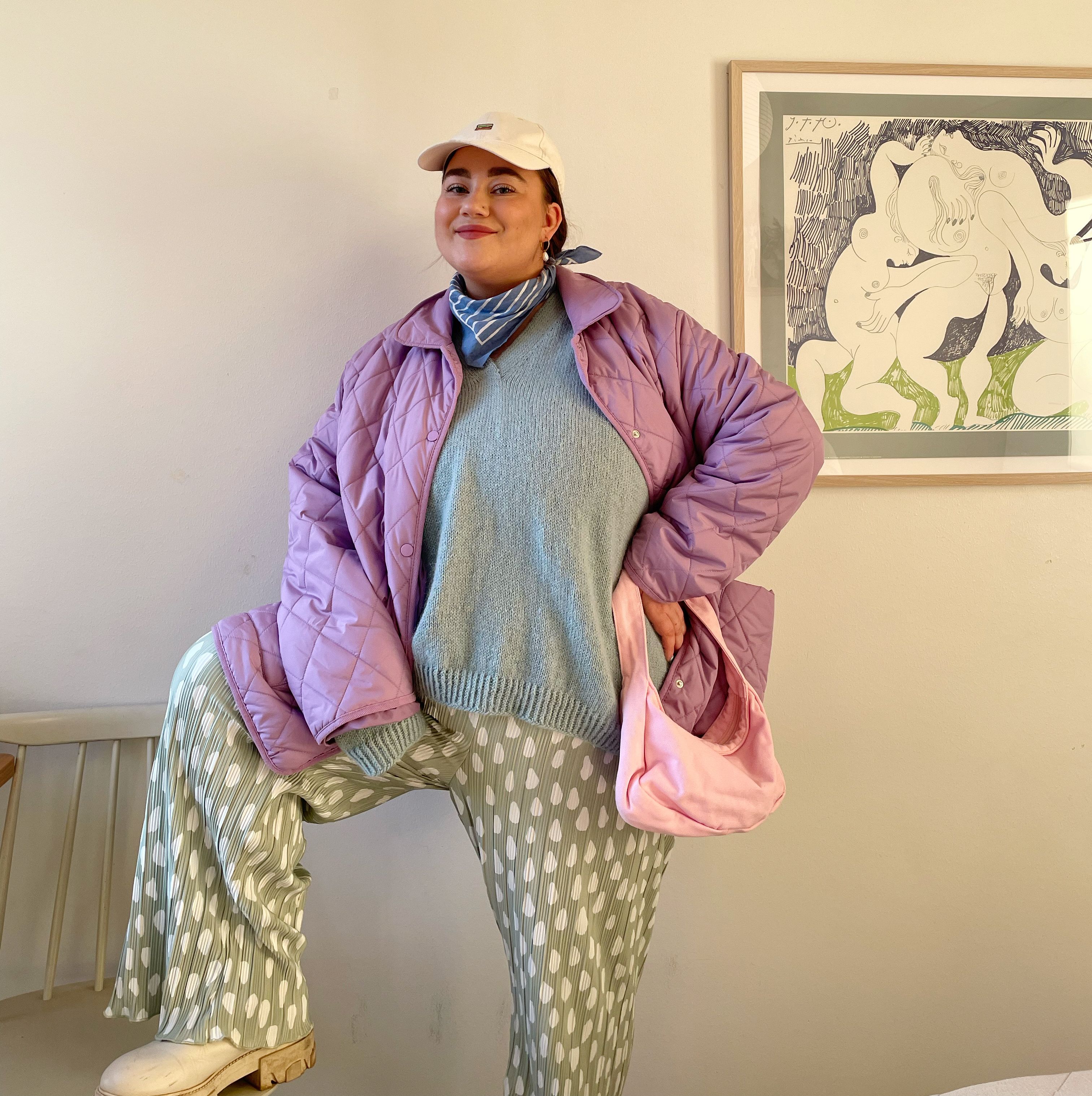 "Pastels all go together, and I dare to mix them up a bit more! Materials are really important to me, especially when I'm out and about, and in winter I usually wear wool under my jacket. A small scarf still works in autumn, in winter I would wear a balaclava on top of the cap. In trousers I like to have fun with prints, sometimes the prints are even more moderate looking when they are not close to the face, tip for the print-phobes!"