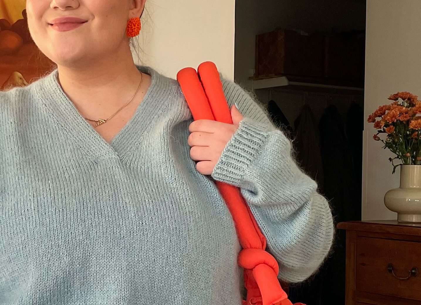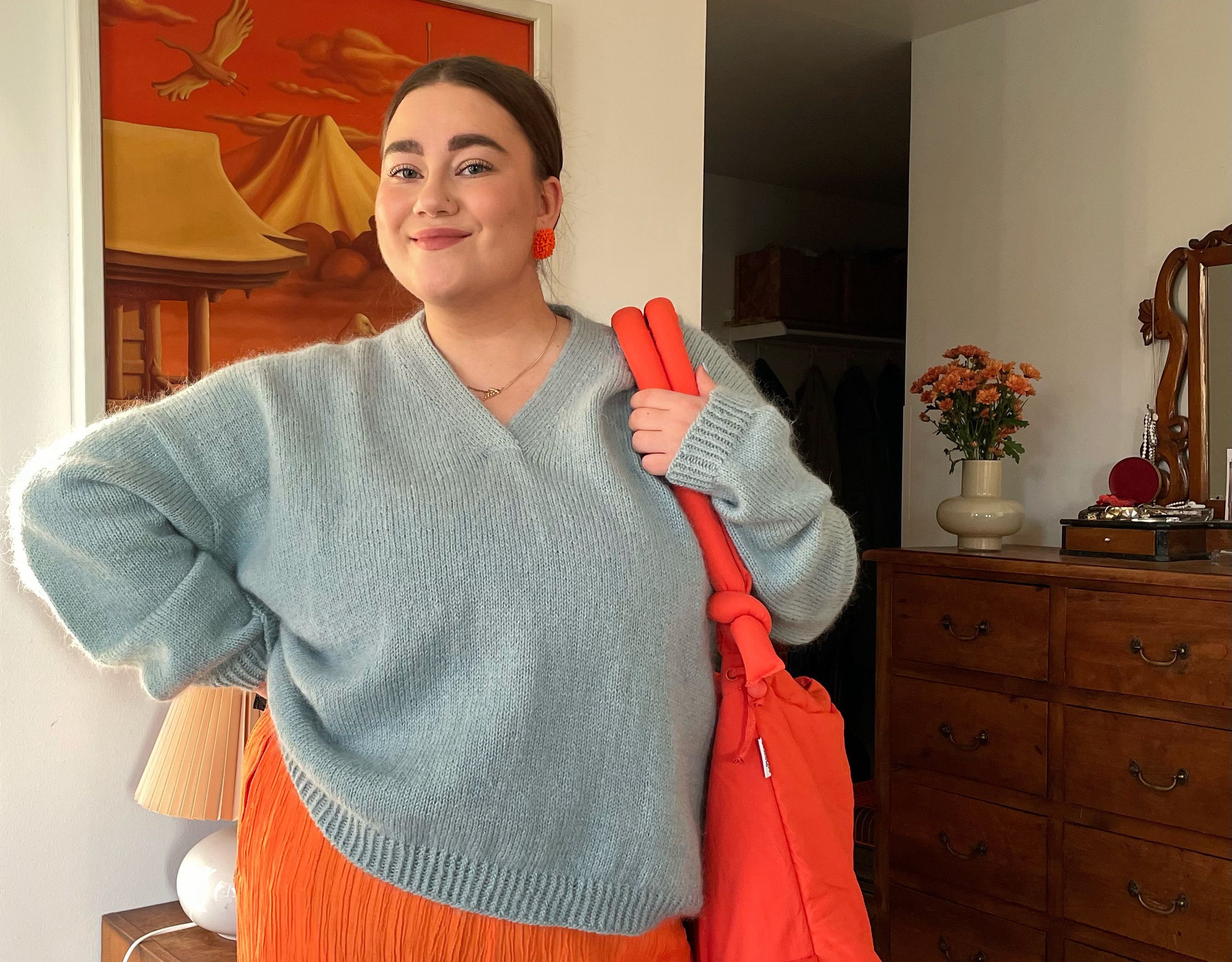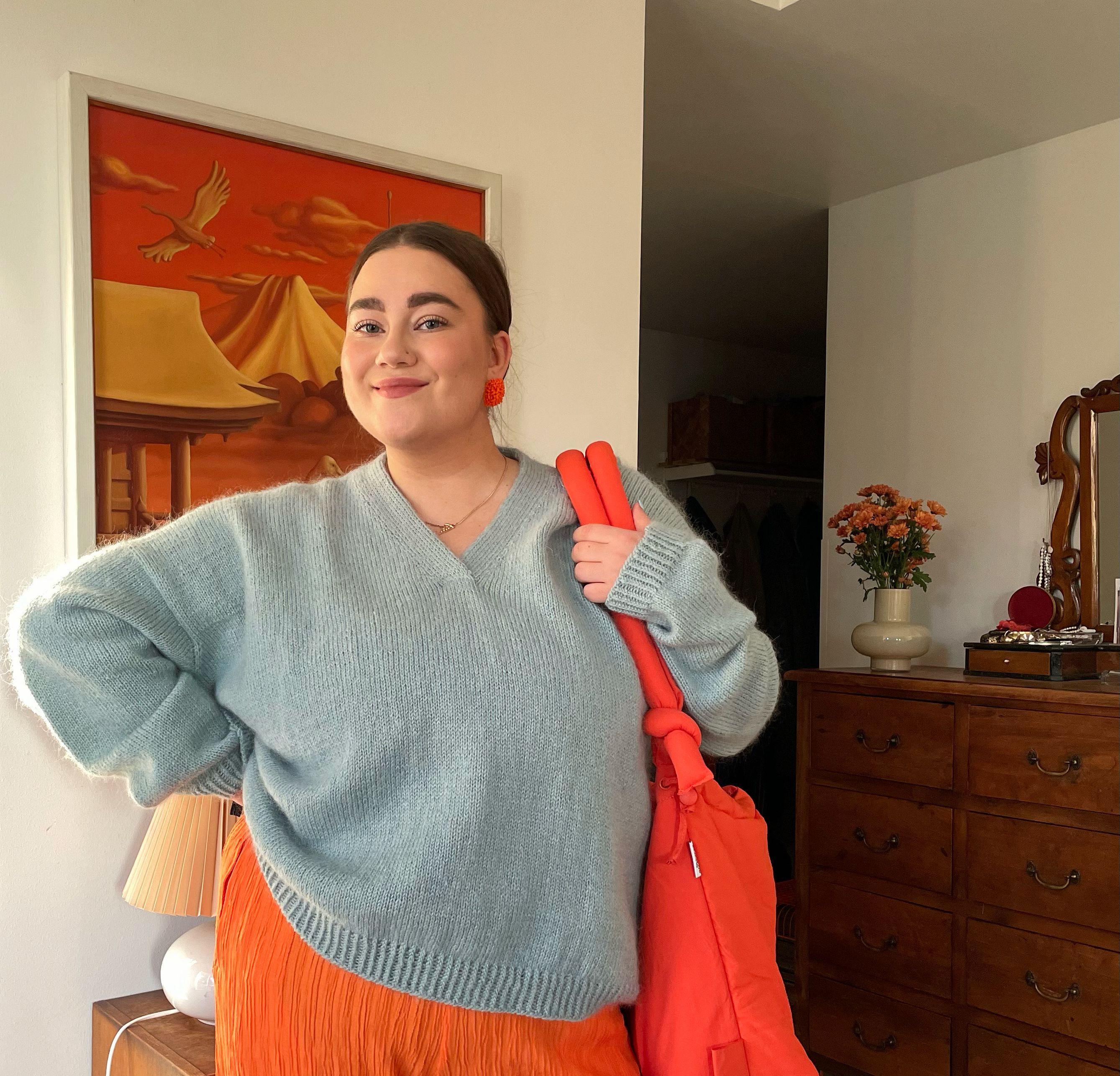 "For me, the deciding factor was surprisingly the v-neck! I've been longing for one in my wardrobe, as I love necklaces, and this one shows off the jewellery beautifully. It's beautiful and practical. I like casual clothes that can still be dressed up or even dressed down when needed, and this knit fits the bill."