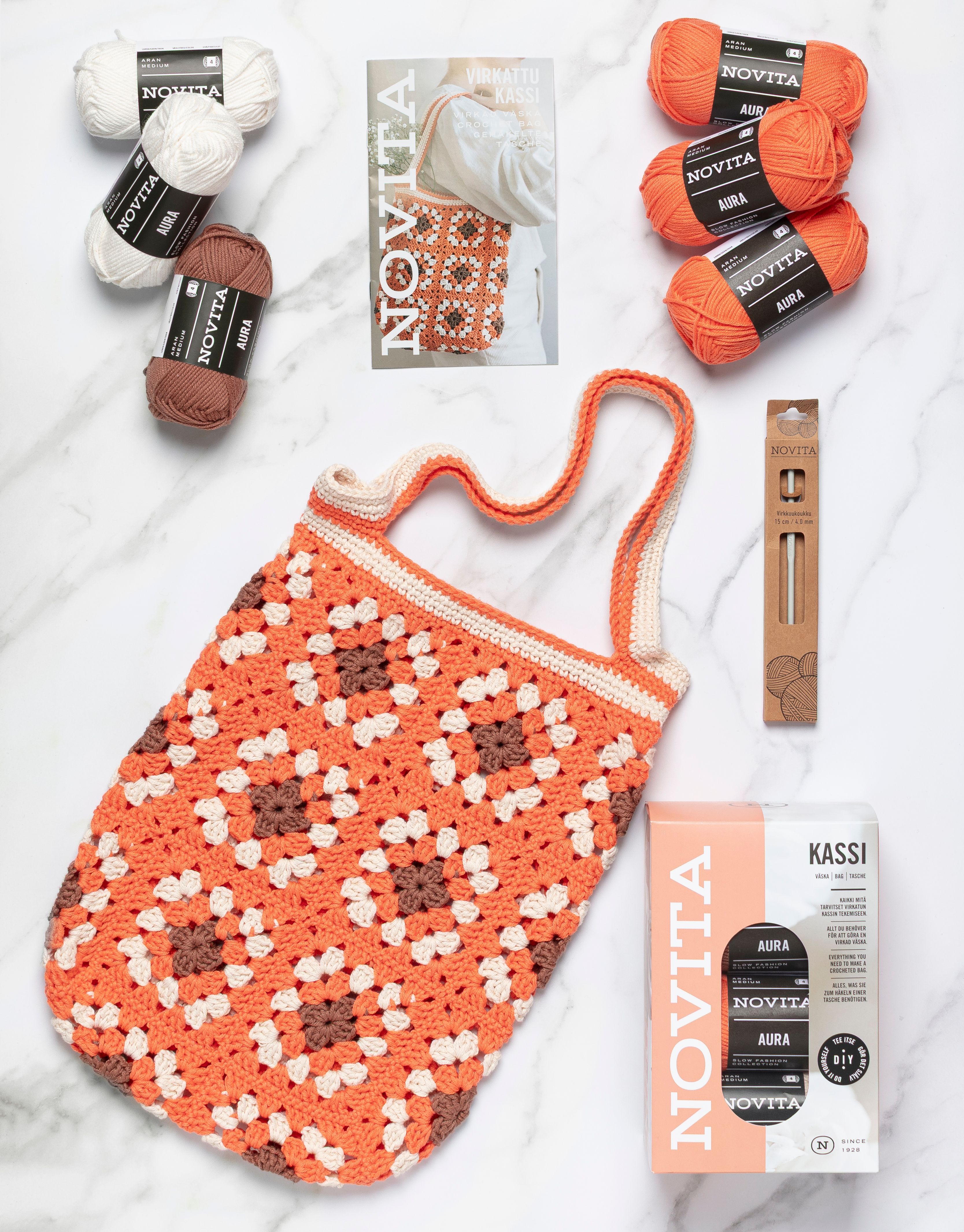 The granny square is here! In the Novita Aura crochet box, you’ll find everything you need to make a crocheted bag. You can crochet the bag yourself or give it as a gift.