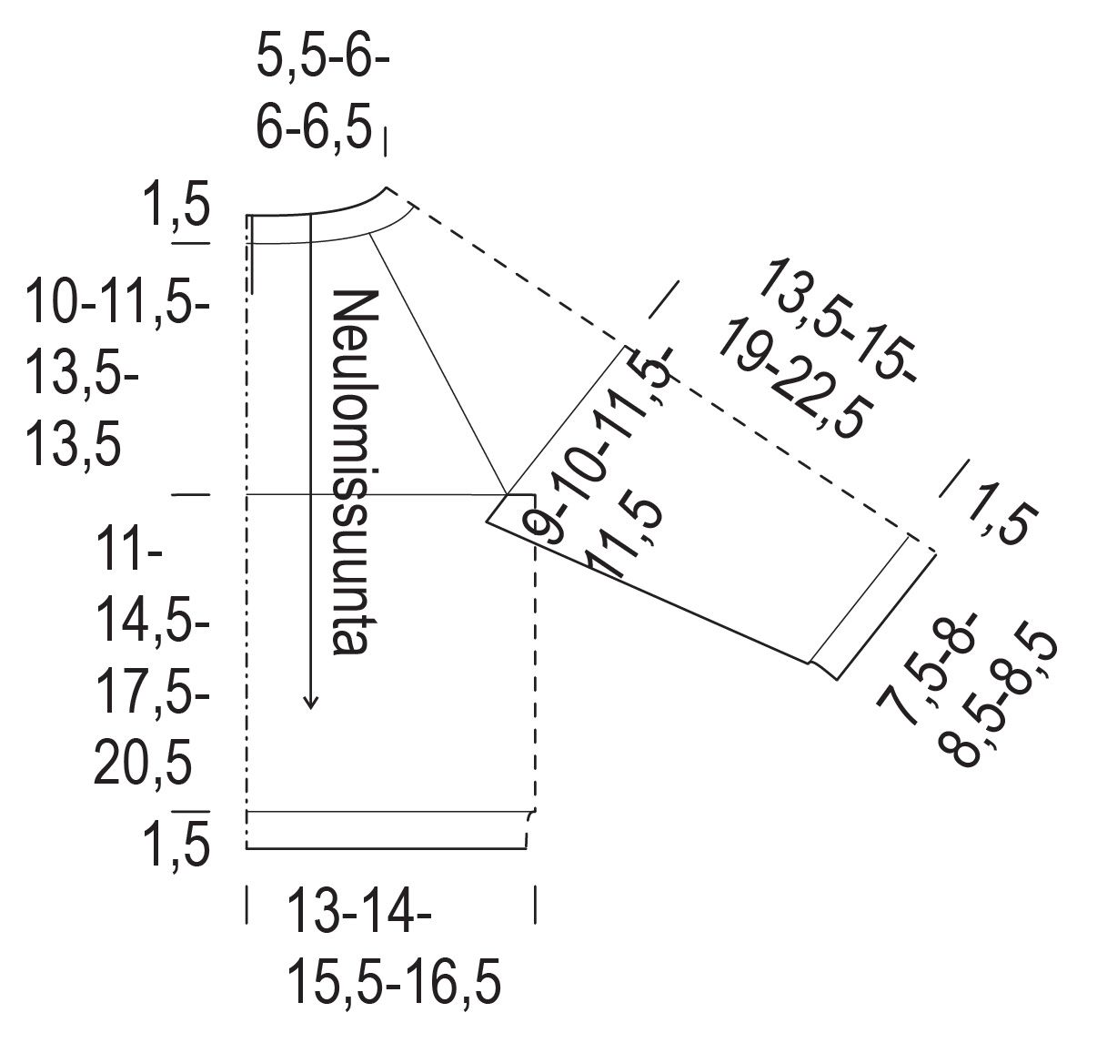 Chest Circumference 18/45.5 (20/51) 22/56 (23/58.5) Inch/cmPullover Circumference 20/51 (22/56)25/64 (26/66) Inch/cmPullover length 9.5/24(11.5/29) 13.5/34 (14.5/37) Inch/cmSleeve length (from underarm) 6/15 (6.5/16.5) 8/20.5 (9.5/24) Inch/cmWrist circumference 6/15 (6.5/16.5) 6.75/17(6.75/17) Inch/cm