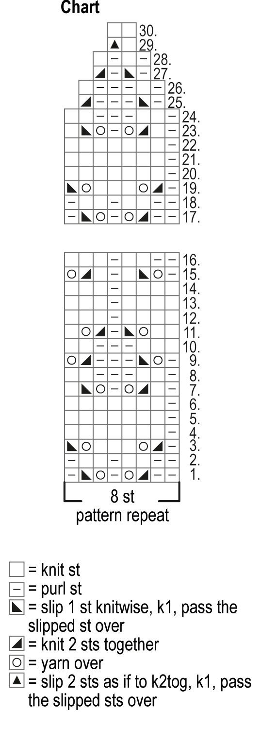 When the ribbing measures 12 cm, begin the lace pattern on row 1 of the chart. Repeat the 8 st pattern 9 times. Work rows 2-6 of the chart.