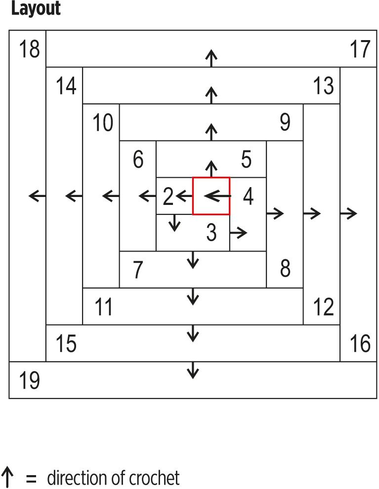 Both sides of the pillow are worked using the log cabin technique. After the first two pieces, work each piece starting from the edges of the previous pieces. See layout diagram for direction of crochet.