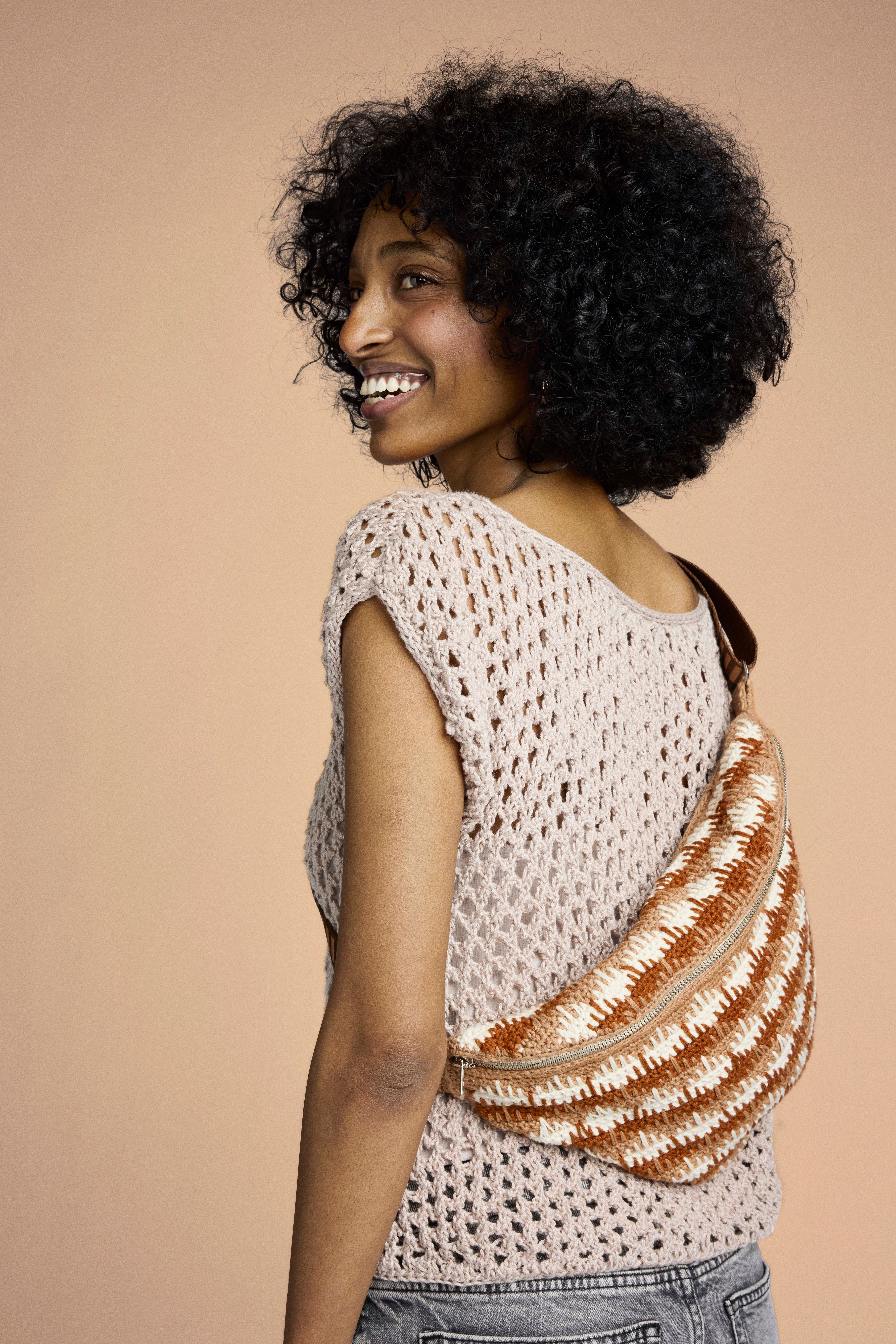 The absolute number one outfit for summer is the bum bag with belt loops. With a surface resembling an embroidery, it's easier to make than it looks at first glance. The Enigme bag is crocheted in three different colours of Cotton Feel yarn. The bag is crocheted in three pieces, the back, the front and the flap, which are finally crocheted together with double crochet.