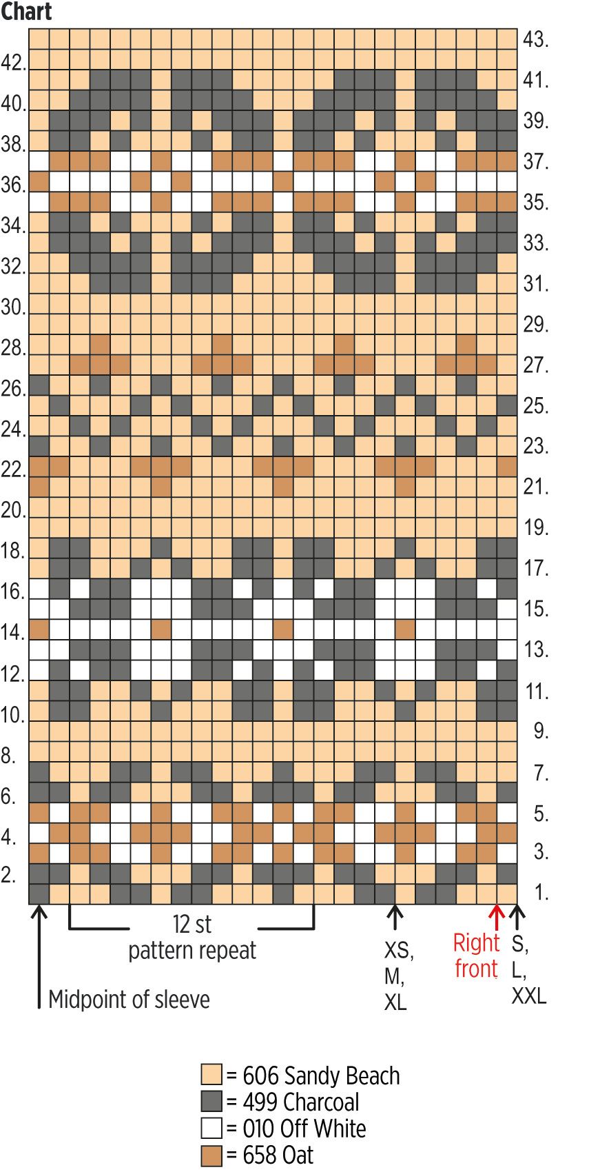 Begin the colourwork pattern on row 1 of the chart. The starting point for each size is marked with an arrow. Keep repeating the 12 st pattern as needed. Work rows 2-43 of the chart, then keep repeating rows 1-43.