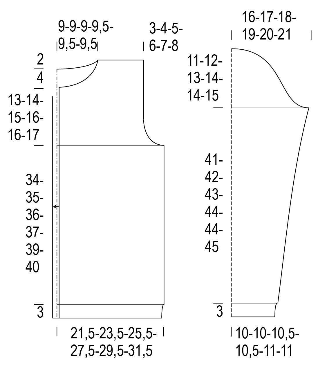 body circumference 86(94)102(110)118(126) cm / 33¾(37)40¼(43¼)46½(49½) in length 56(58)60(62)64(66) cm / 22(22¾)23½(24½)25¼(26) in inner sleeve length 44(45)46(47)47(48) cm / 17¼(17¾)18(18½)18½(19) in