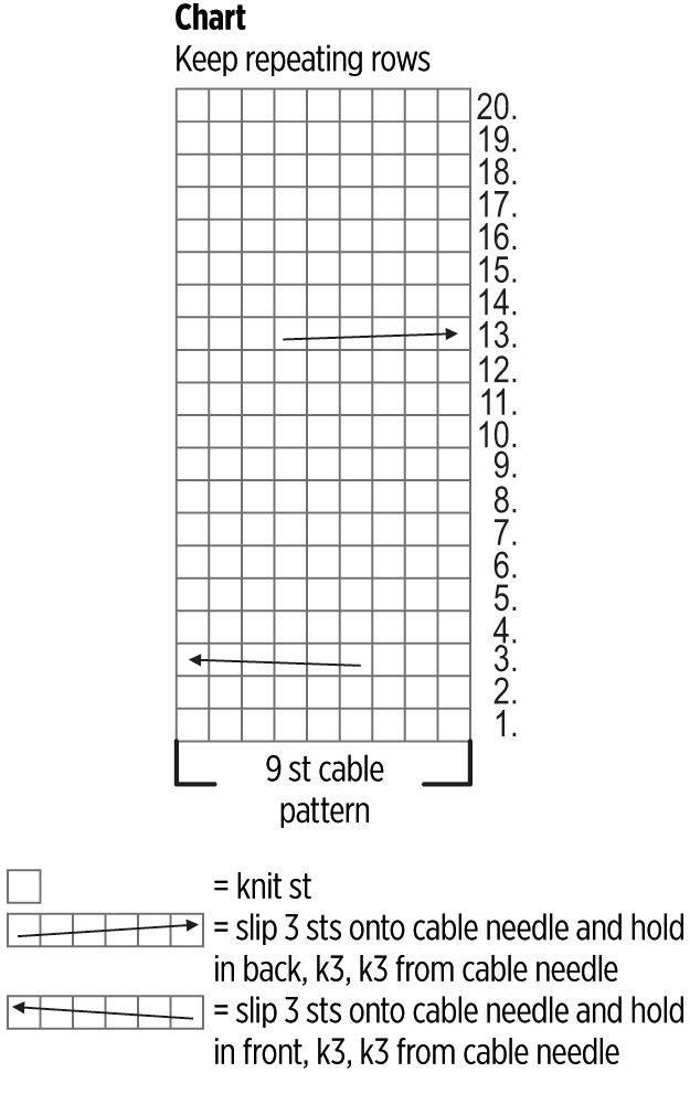 Reverse stockinette stitch: purl the right side rows and knit the wrong side rows. Reverse stockinette stitch in the round: purl all rows. Cable pattern: follow the chart and instructions. Ribbing in the round: *k1, p1*