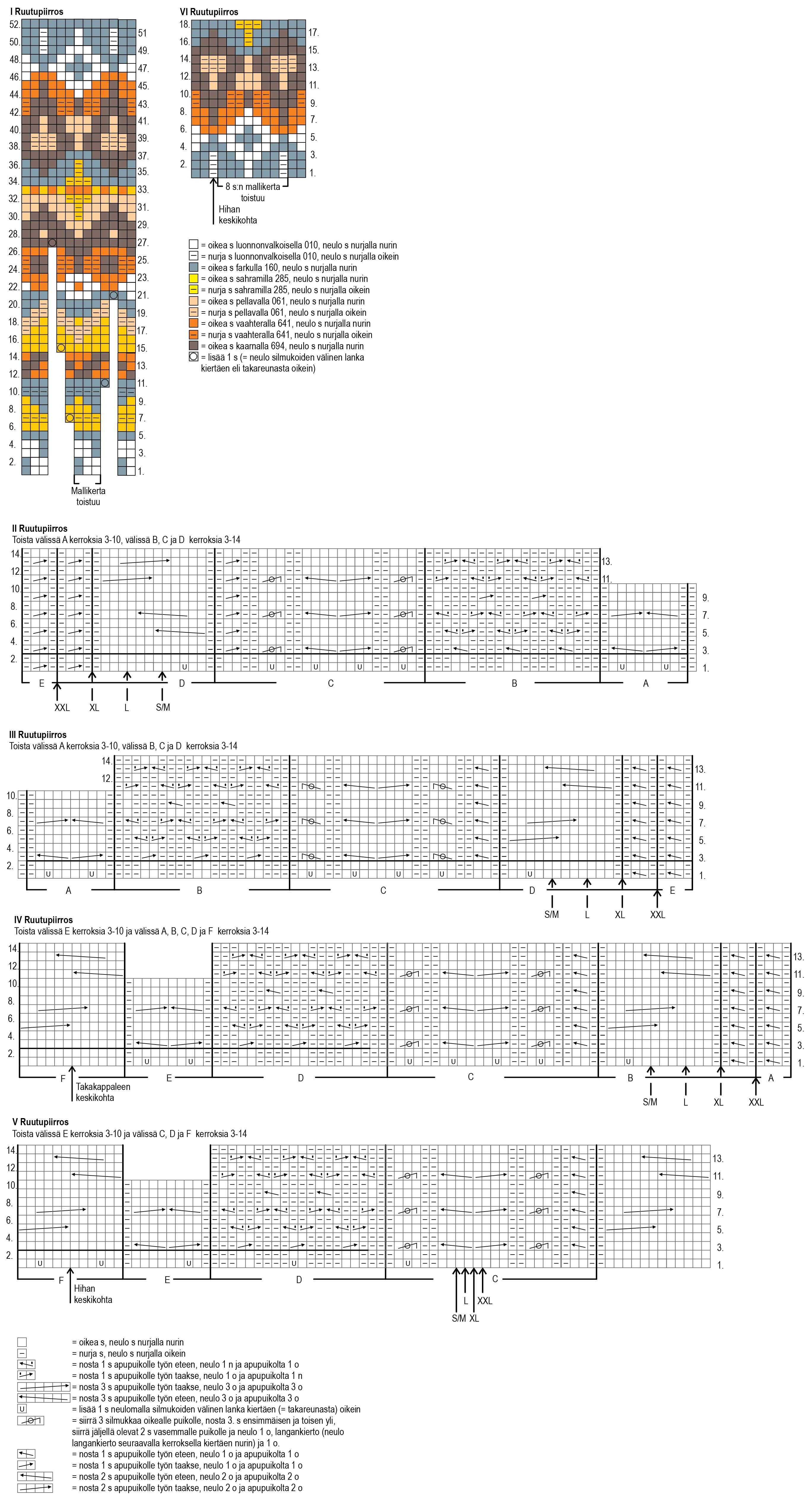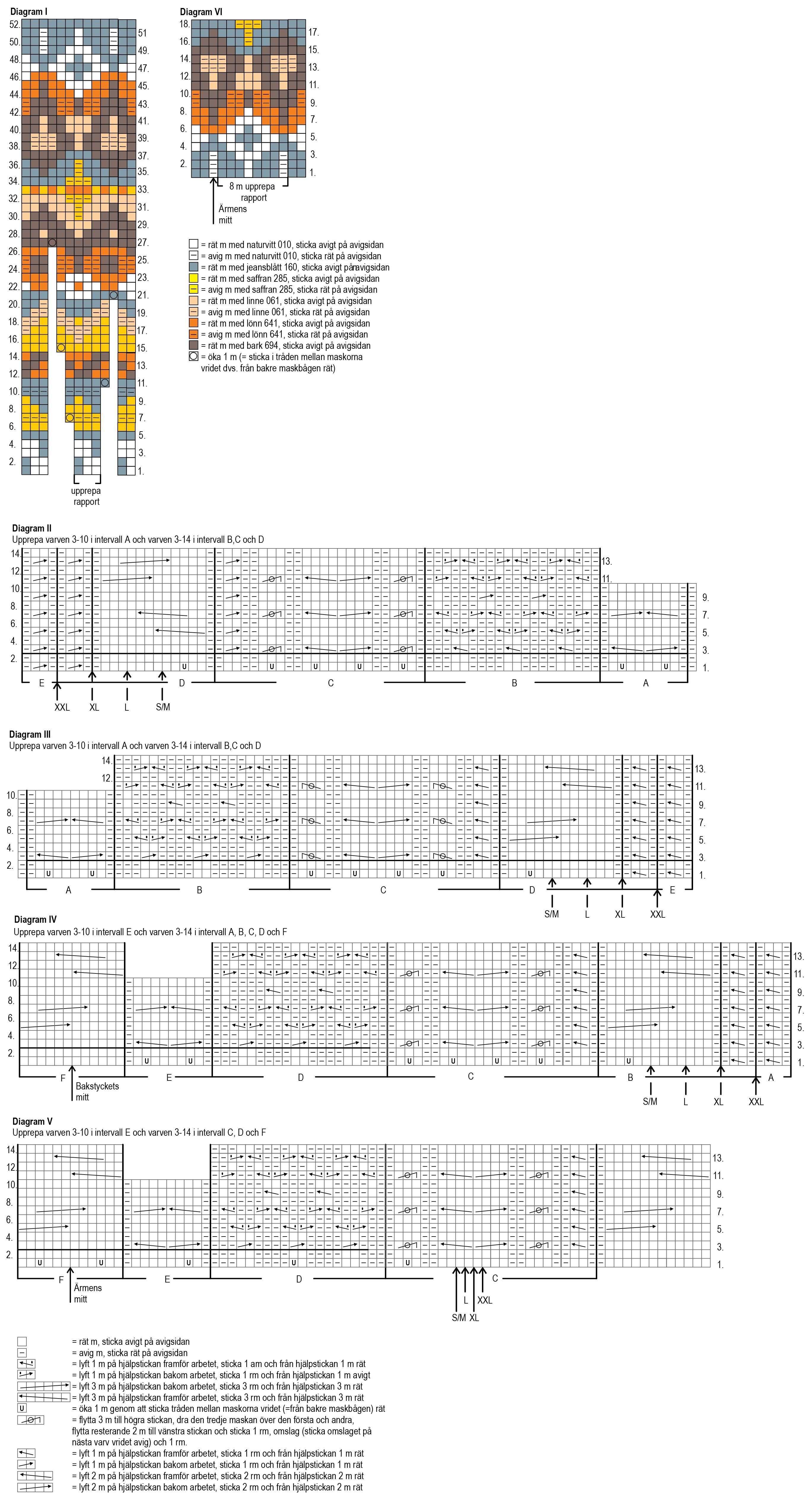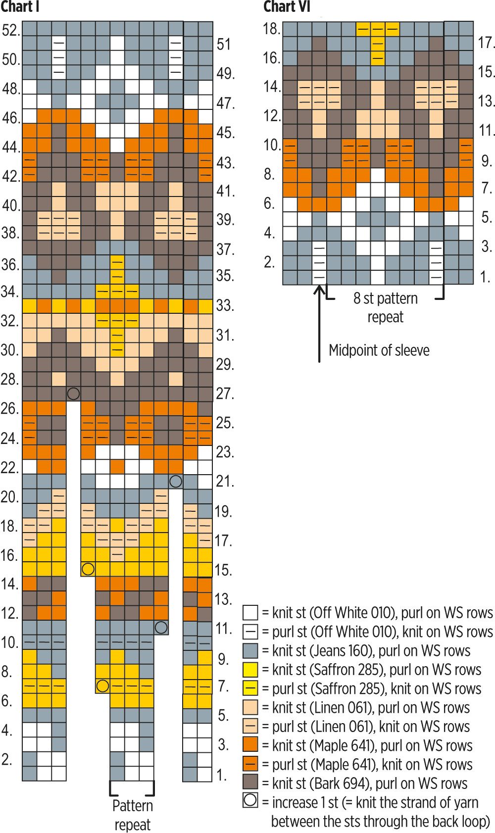 Note: When the piece measures approx. 30(31)31(32) cm, begin the colourwork pattern on row 1 of chart VI. The midpoint of the piece is marked with an arrow, use that to determine the starting point. Work rows 2-18 of the chart.
