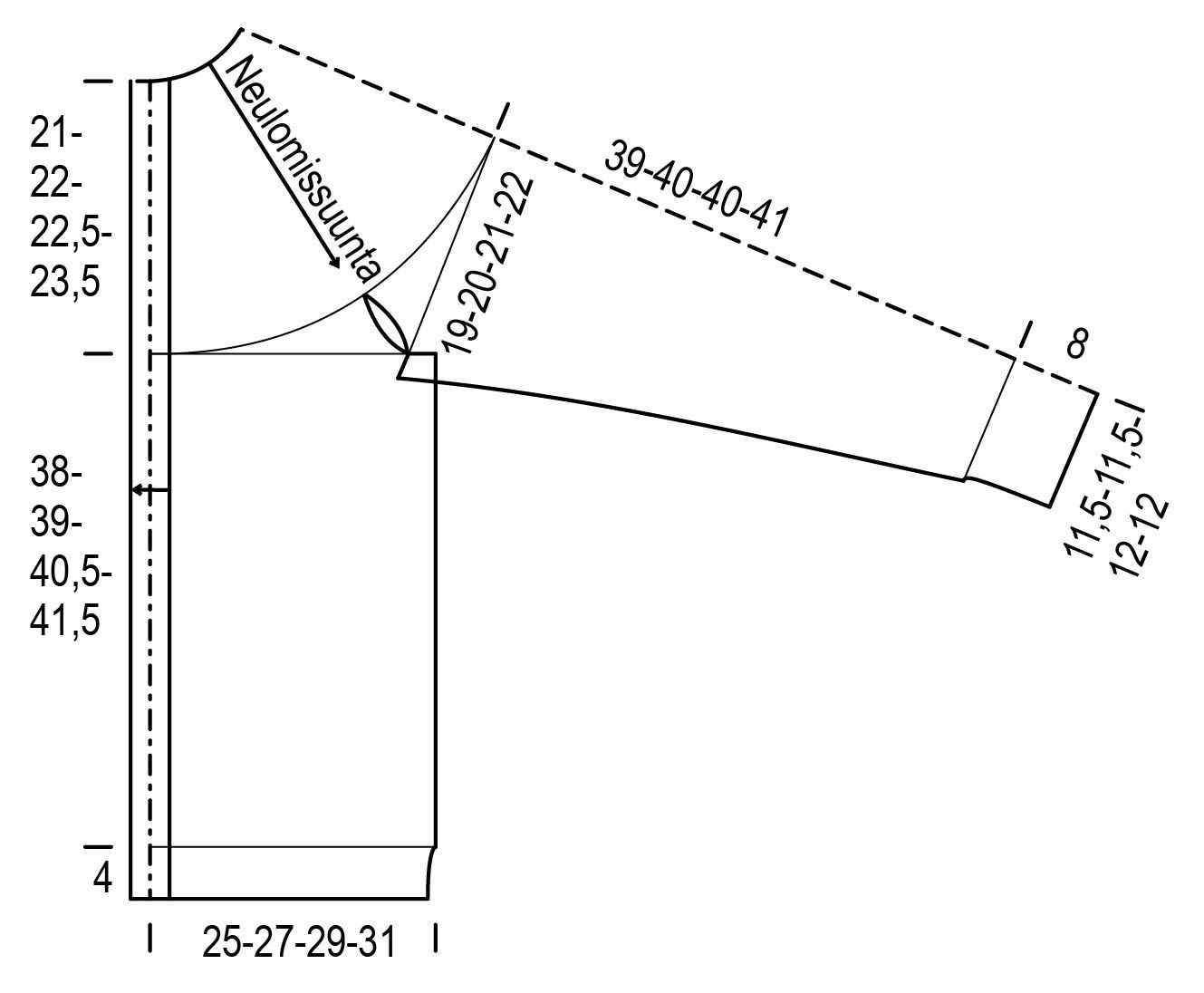 body circumference 100(108)116(124) cm / 39¼(42½)45¾(48¾) in middle back length 63(65)67(69) cm / 24¾(25½)26½(27¼) in inner sleeve length 47(48)48(49) cm / 18½(19)19(19¼) in