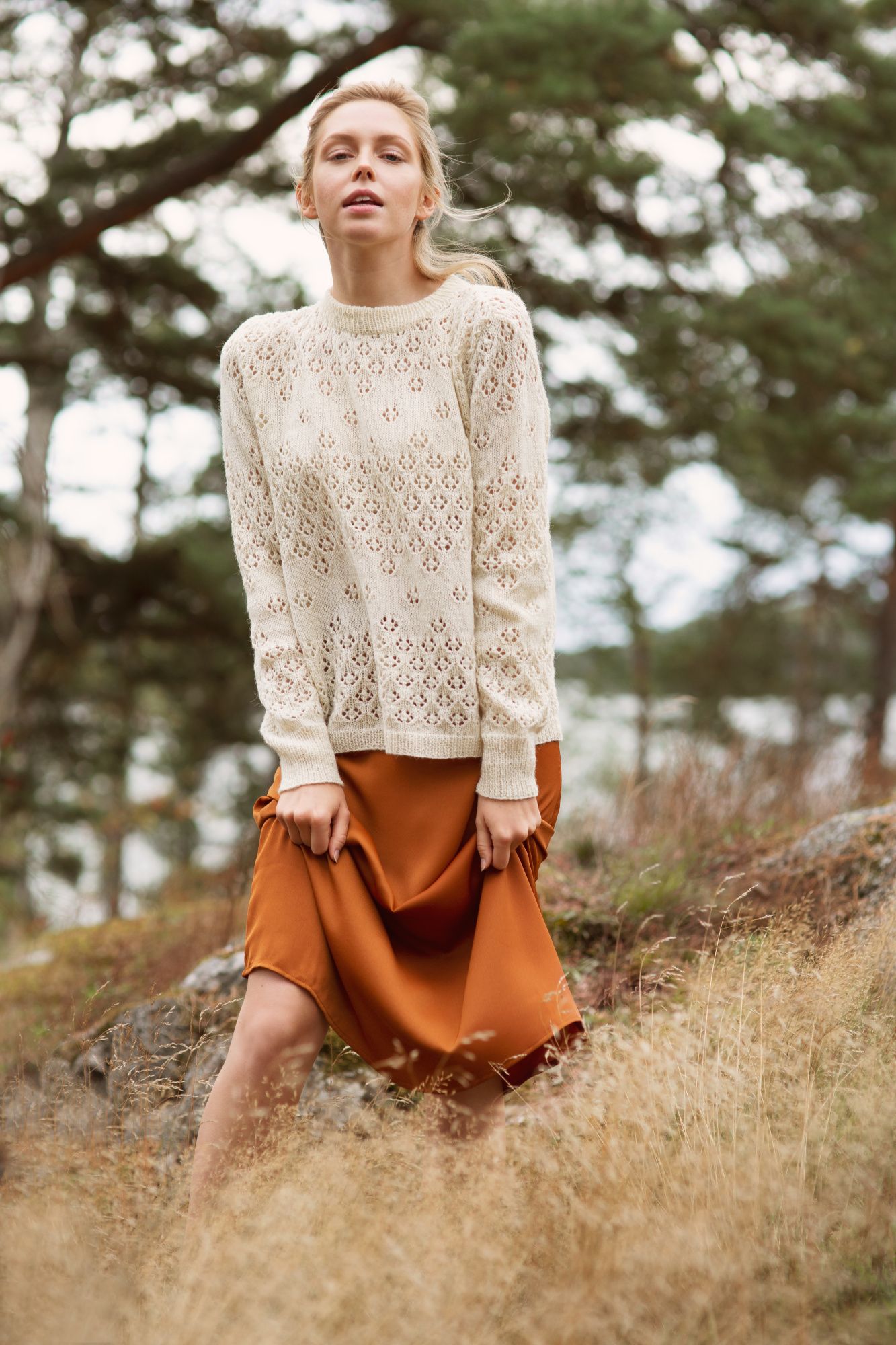 Light and delicate, this sweater by Sari Nordlund features a flowery lace pattern.