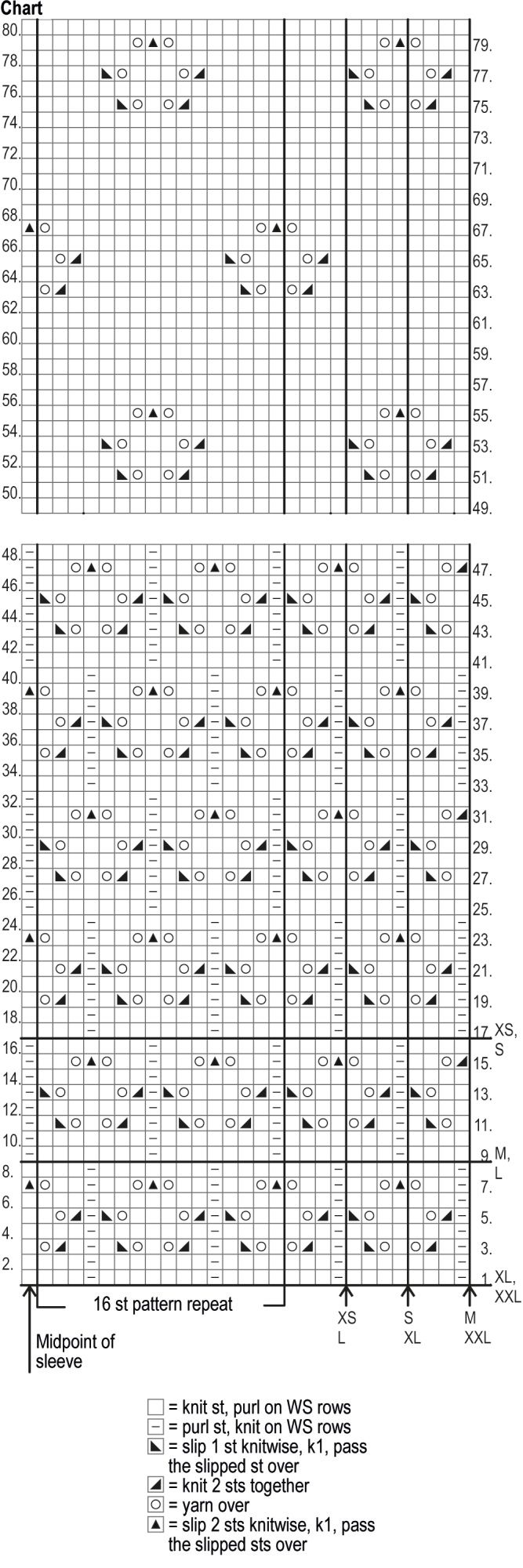 Begin the lace pattern on row 17(17)9(9)1(1) of the chart: work 1 edge st, begin the lace pattern at the correct starting point for your size, keep repeating the 16 st pattern until 1 st remains, work the last st. Keep 1 edge st at both ends. Work rows 18(18)10(10)2(2)-80 of the chart. Then keep repeating rows 9-80 for the rest of the piece.