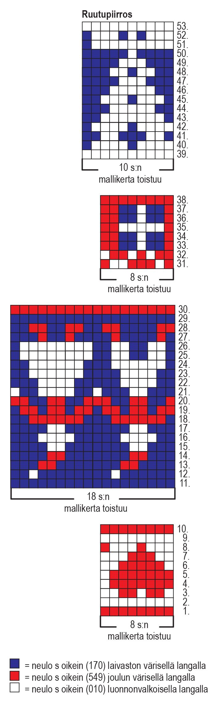 Kuusijuhla is an endearing Christmas stocking – why not knit one for everyone in the whole family! Adorned by a colourwork pattern depicting hearts, dancing elves, presents and Christmas trees, the stocking can be filled with lots of exciting things. The stocking is knitted top-down using the Novita 7 Veljestä yarn, just like a regular sock.