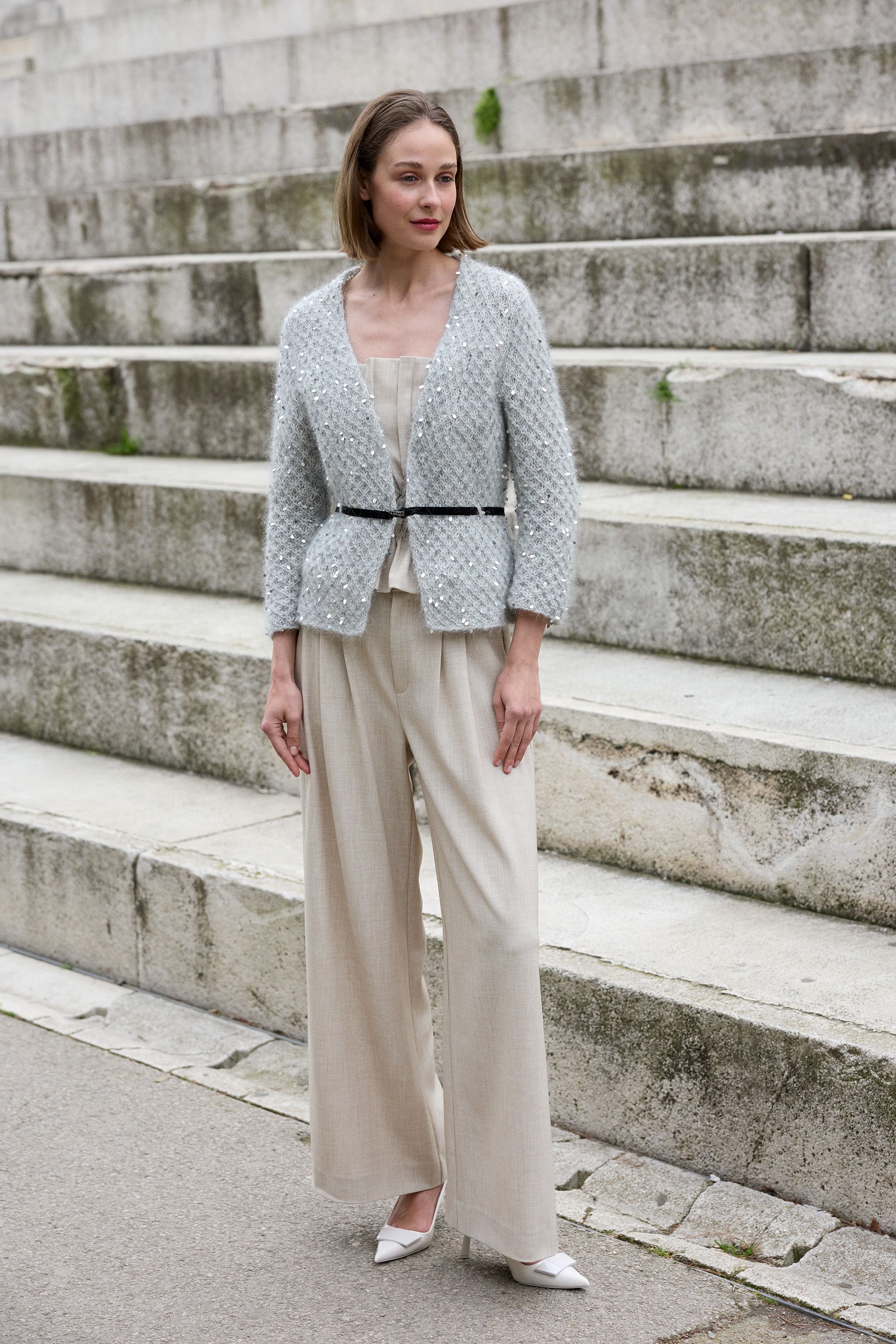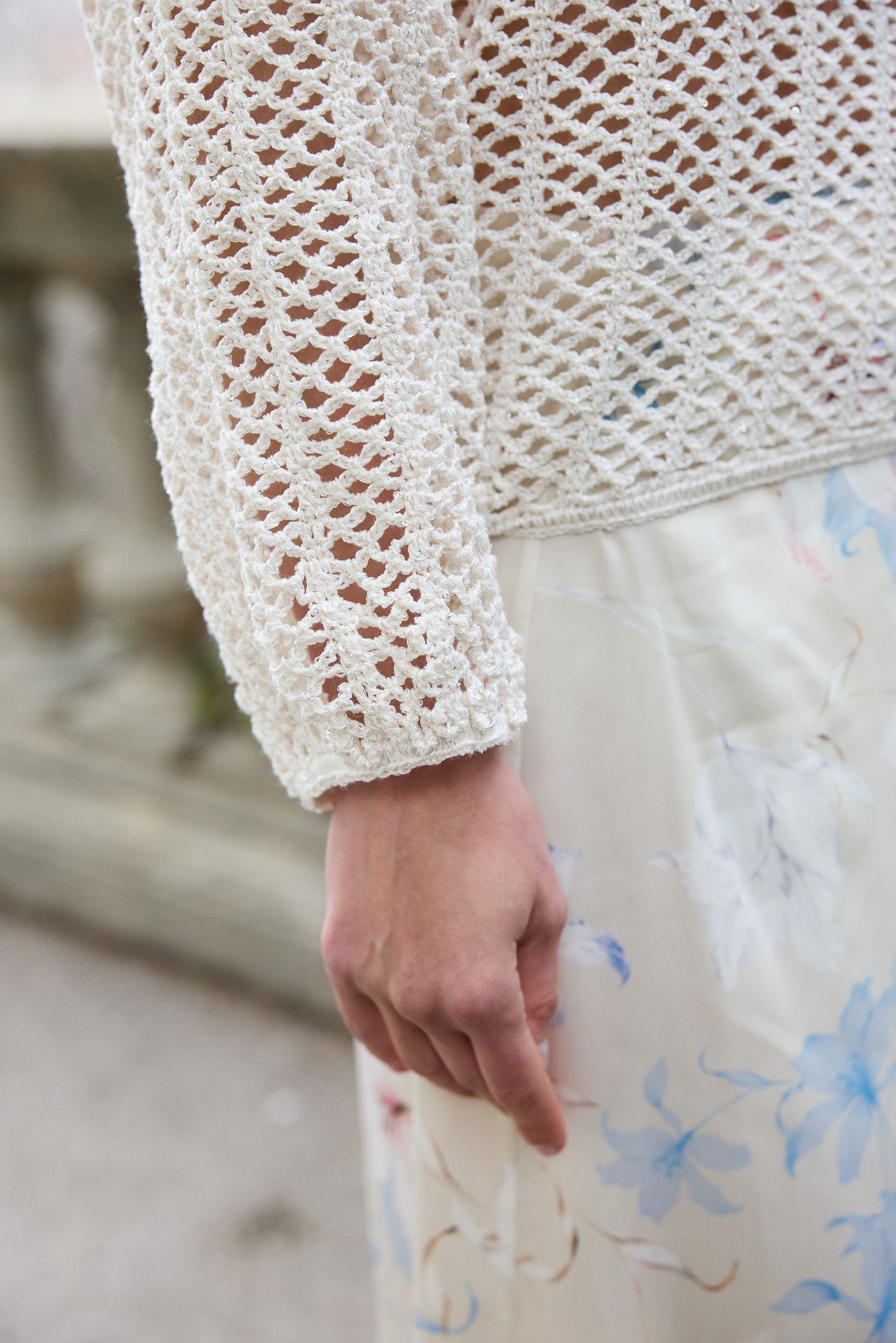 This crochet sweater is a stunning garment that will keep you cool even during the hottest summer days. The sweater combines a meshfabricand vertical stripes crocheted in trebles. The festive look is thanks to elegant glimmer of the Novita Valo yarn, containing tiny transparent sequins which will give the garment an irresistible sparkle especially when they are moving. The Rita sweater goes equally well with a dress or a skirt.