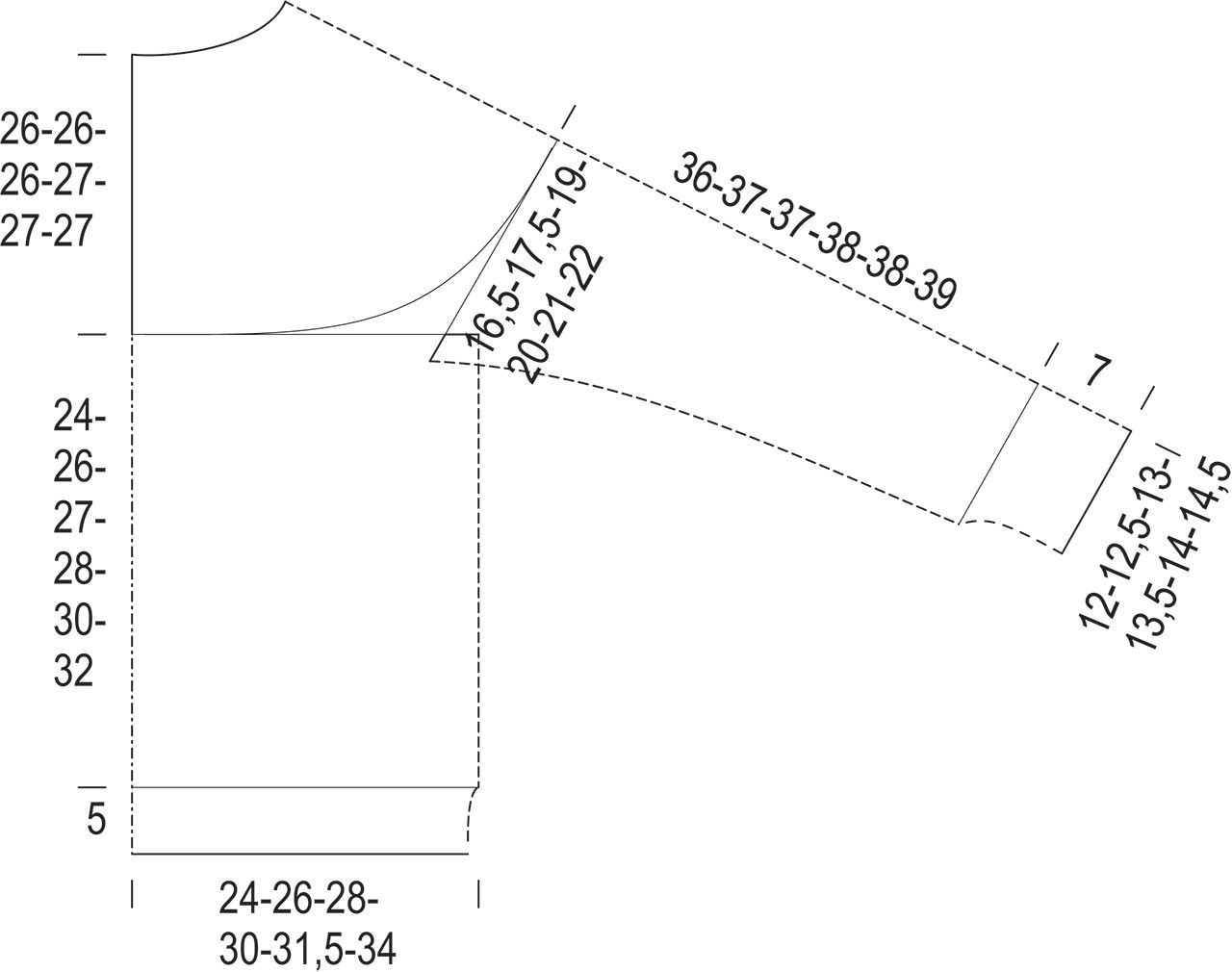inner sleeve length 43(44)44(45)45(46) cm / 17(17¼)17¼(17¾)17¾(18) in