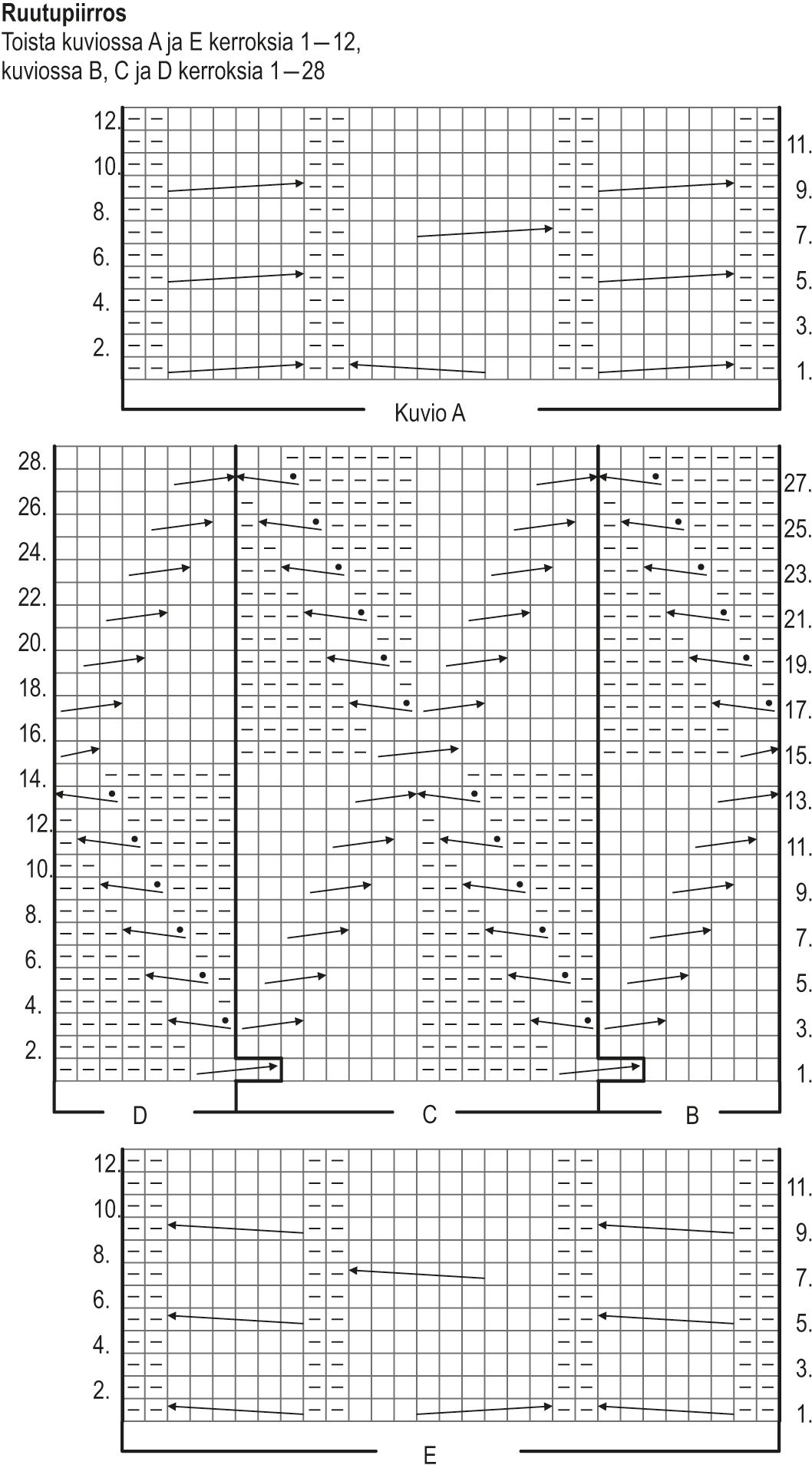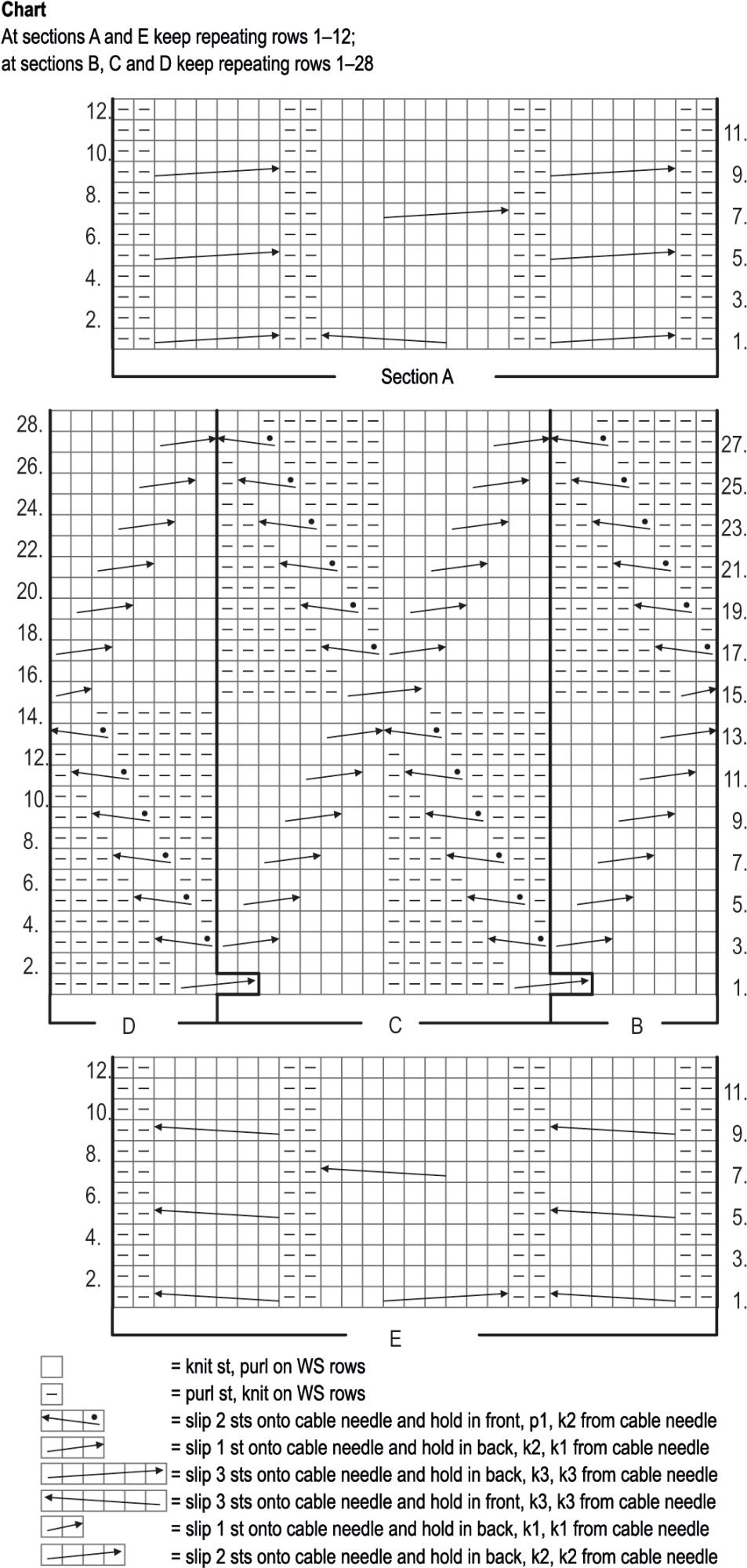 Begin the cable pattern on the RS on row 1 of the chart: work 4 sts in garter st, work section A (= 29 sts), section B (= 6 sts), repeat section C 4 times (= 64 sts), section D (= 10 sts), section E (= 29 sts), work 4 sts in garter st. Keep working 4 sts at both ends in garter st. At sections A and E work rows 2-12 and then keep repeating rows 1-12. At sections B, C and D work rows 2-28 and then keep repeating rows 1-28.