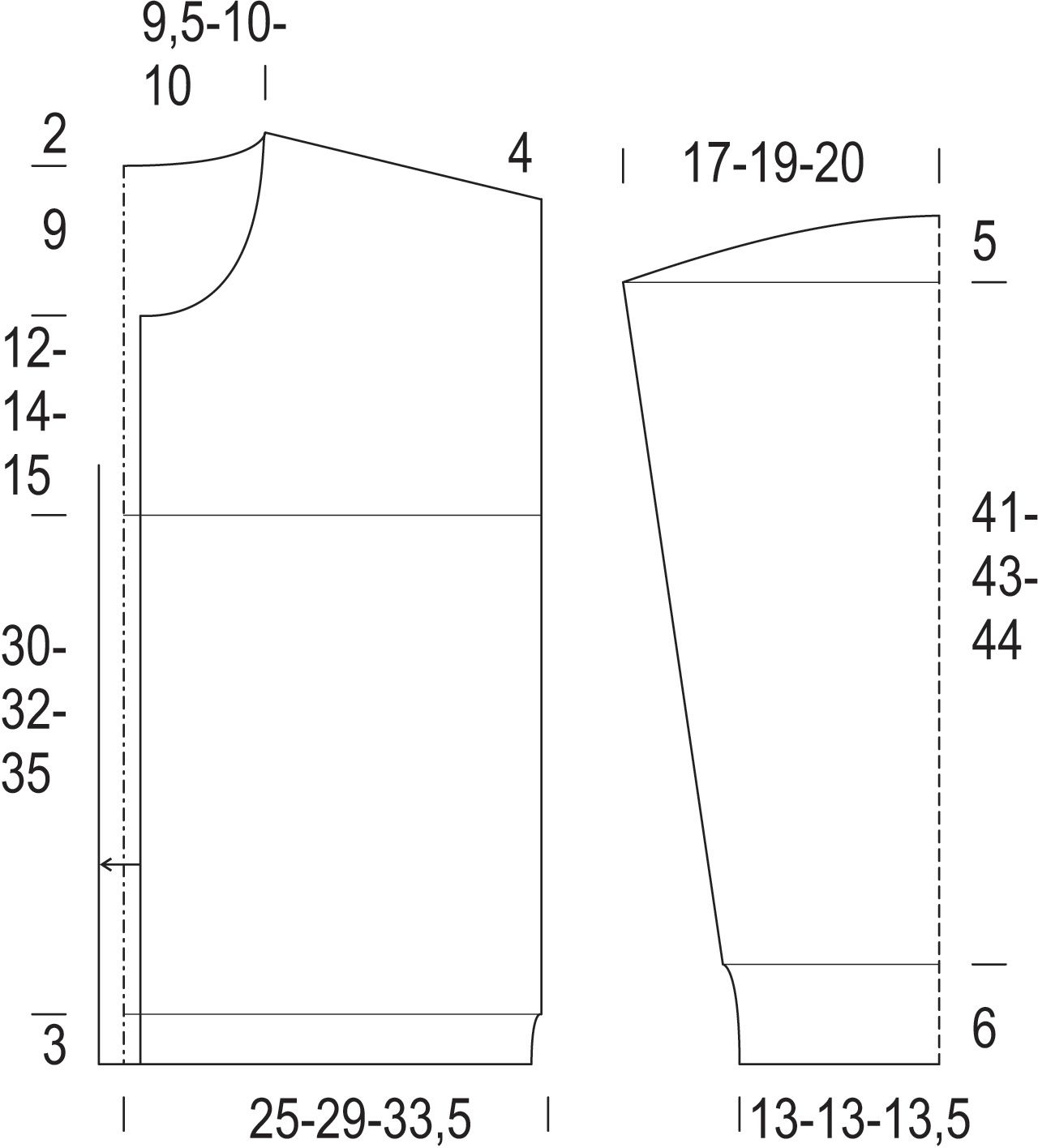 Note: When the armhole measures 19(21)22 cm, on every other row bind off for shoulder at the right end: 2x7 sts and 4x8 sts (4x9 sts and 2x10 sts) 5x11 sts and 1x12 sts.