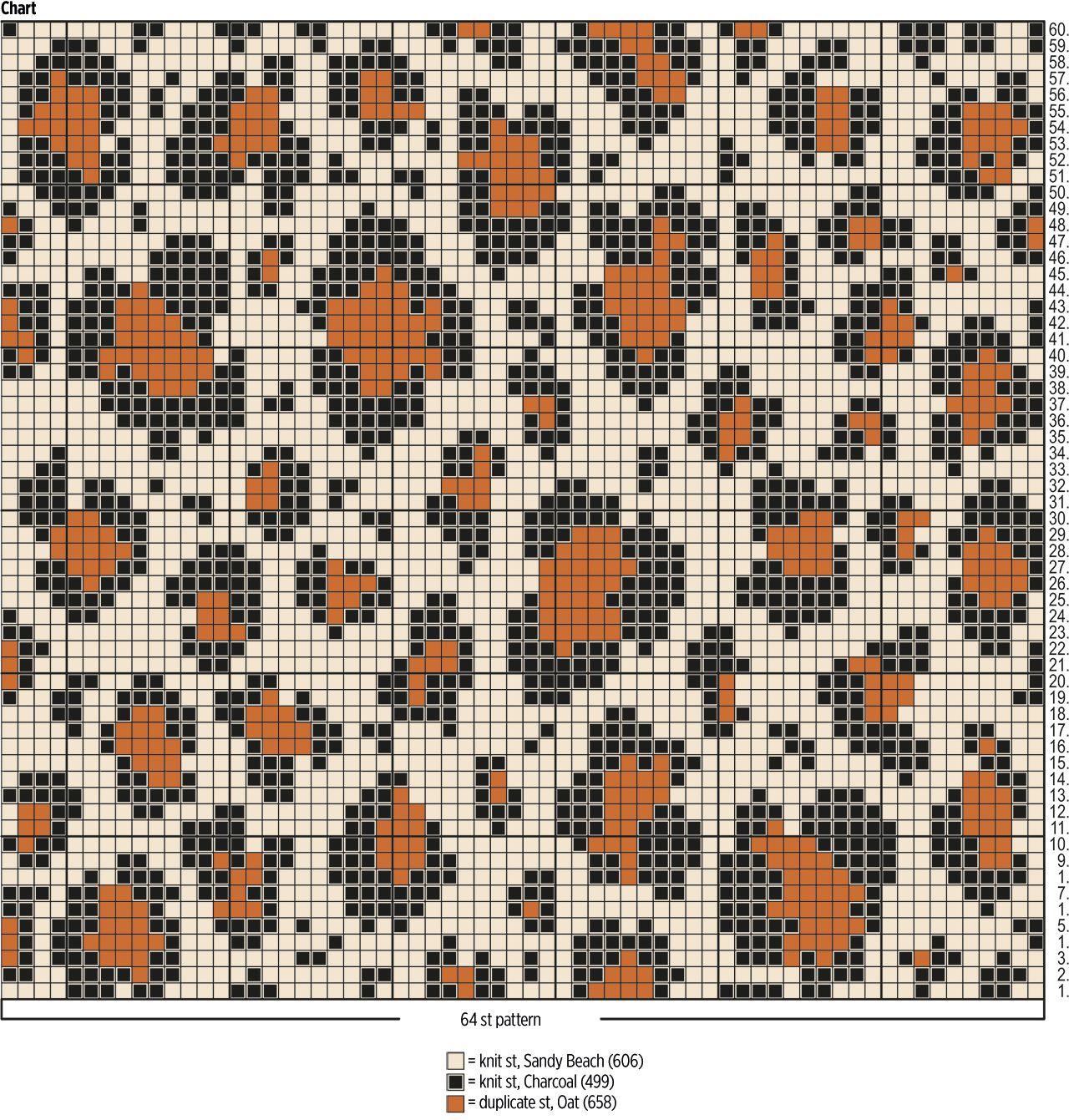 Join Charcoal and begin the colourwork pattern on row 1 of the chart. Work the 64 st pattern. Note: Work the Oat-coloured boxes in the chart using Sandy Beach. The Oat yarn is used for duplicate stitches after the work is finished. Work rows 2-60 of the chart, then keep repeating rows 1-60.
