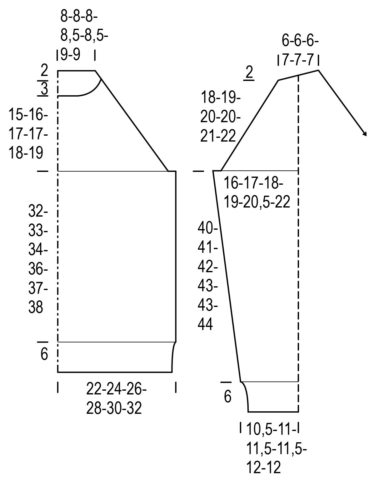When the piece measures 46(47)48(49)49(50) cm, on every other row bind off 1x2(3)4(6)7(9) sts and 1x2 sts = 60(60)62(62)64(66) sts.