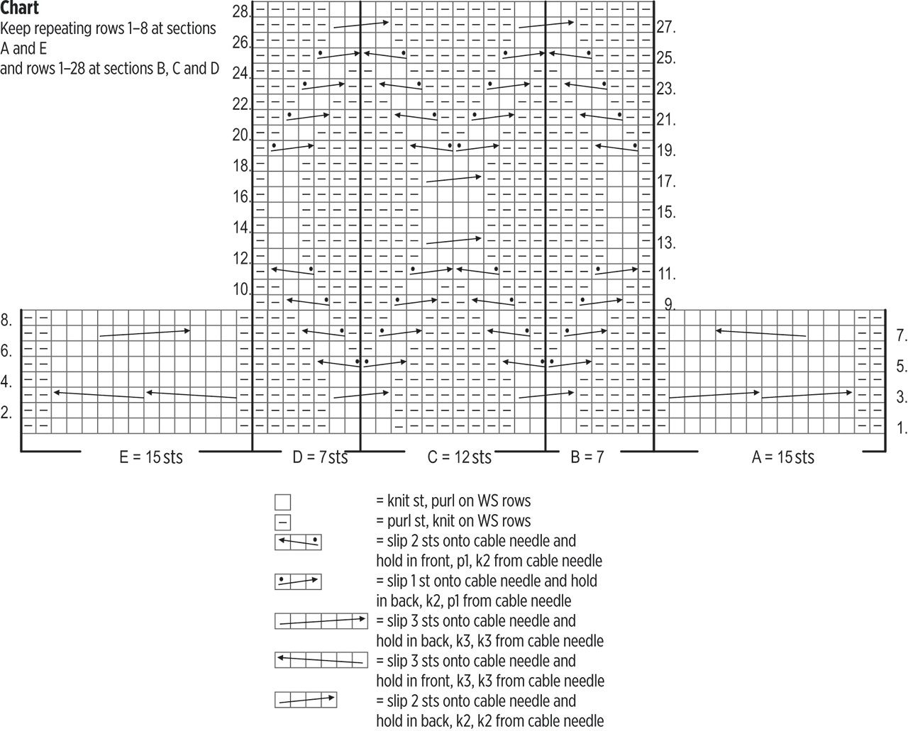 Switch to the larger needles and begin the pattern on row 1 of the chart: work 11(15)19(22)26(29) sts in seed st, work section A (= 15 sts), section B (= 7 sts), section C 3 times (= 36 sts), section D (= 7 sts), section E (= 15 sts), work 11(15)19(22)26(29) sts in seed st. At sections A and E work rows 2-8 and then keep repeating rows 1-8. At sections B-D work rows 2-28, then keep repeating rows 1-28.