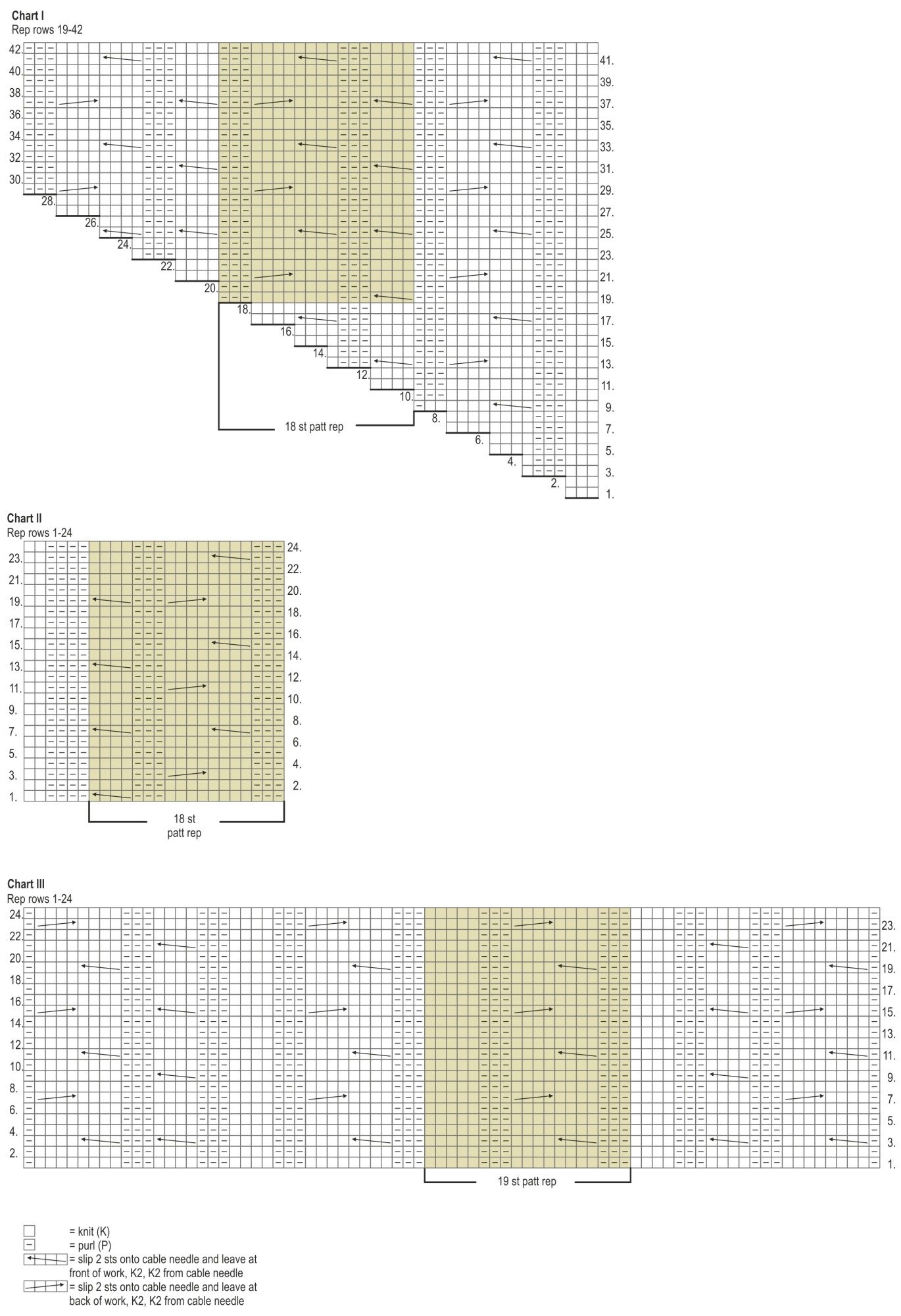24 sts and 25 rows to 10 cm measured over cable patt (chart II.)