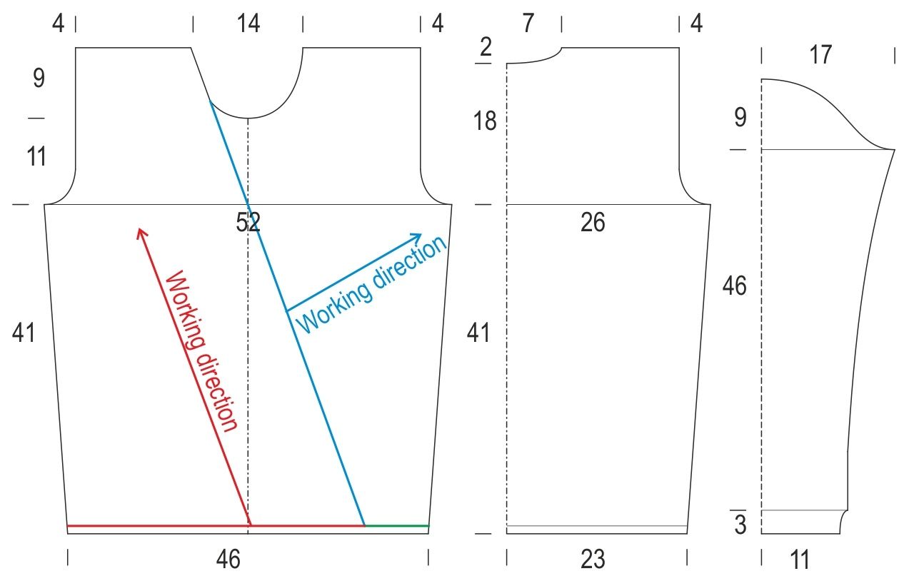 Flatten the pieces to the desired dimensions on an even surface, wrong side up. Wet with water spray, and allow to dry. Join both shoulder seams. Join the edge seam in hem on right end of front.