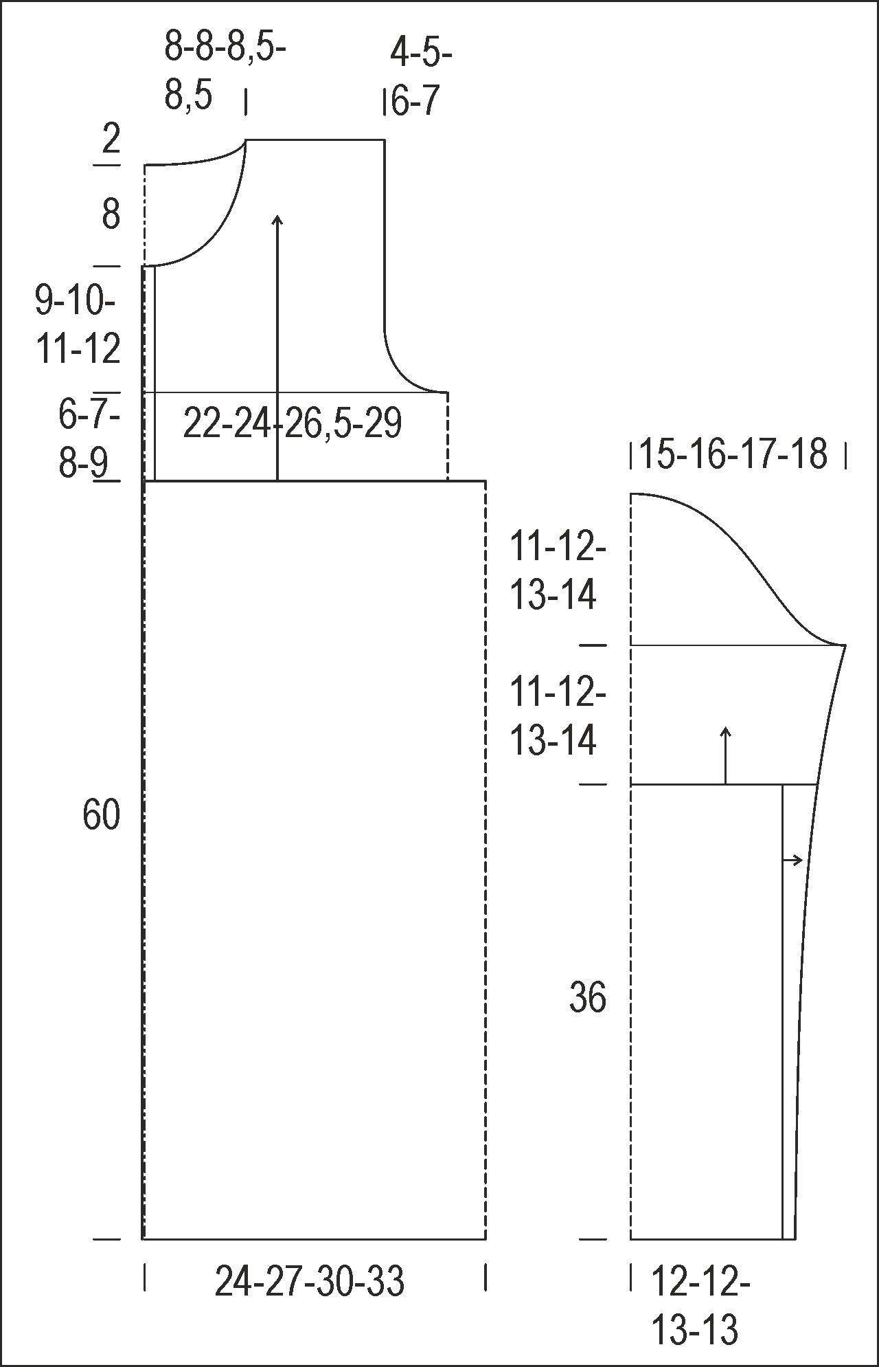 Bust: 88[96:106:116] cm Length: 85[87:89:91] cm Inner length of the sleeve: 47[48:49:50] cm