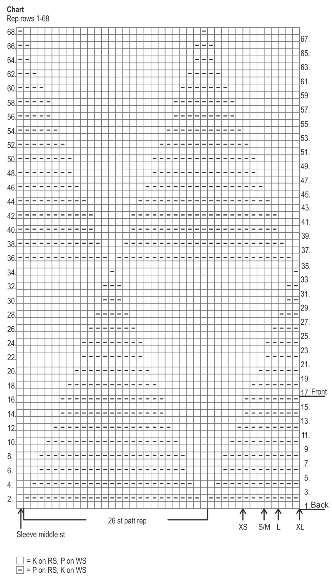 Row 1: Start working from an arrow marked for your size, rep 26 st pattern until the end of the row. Rep rows 1-68.