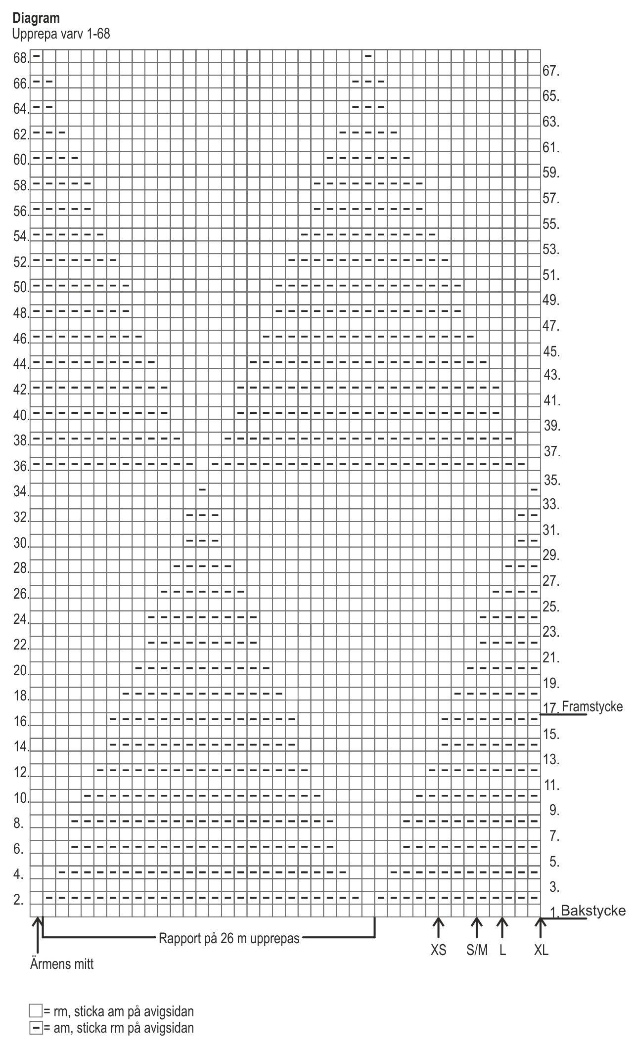Row 17: Start working from an arrow marked for your size, rep 26 st pattern until the end of the row. Work rows 17-68. Then rep rows 1-68.