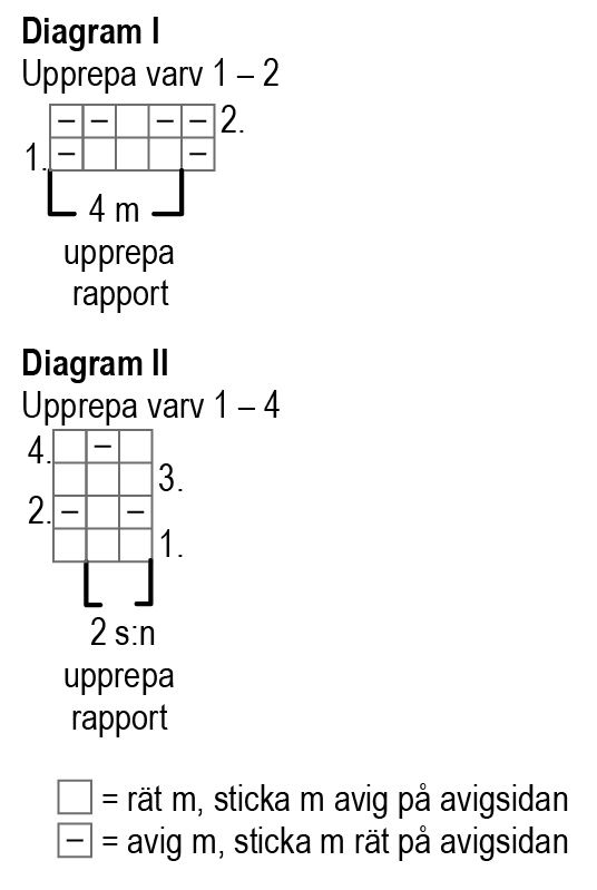 First work the pocket lining. Cast on 29(29)29(33)33(33) sts and begin the broken seed stitch from row 1 of chart II. Keep repeating the 2 st pattern repeat to end of row. Work row 2 of chart and then keep repeating rows 1-2.