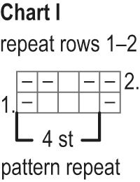 When the piece measures 5 cm, begin the broken seed stitch from row 1 of chart II. Keep repeating the 2 st pattern repeat to end of row. Work rows 2-4 of chart and then keep repeating rows 1-4.