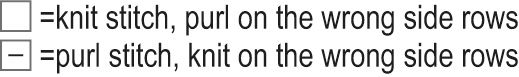 When the piece measures 18 cm, begin the broken seed stitch from row 1 of chart II. Keep repeating the 2 st pattern repeat to end of row. Work rows 2-4 of chart and then keep repeating rows 1-4.