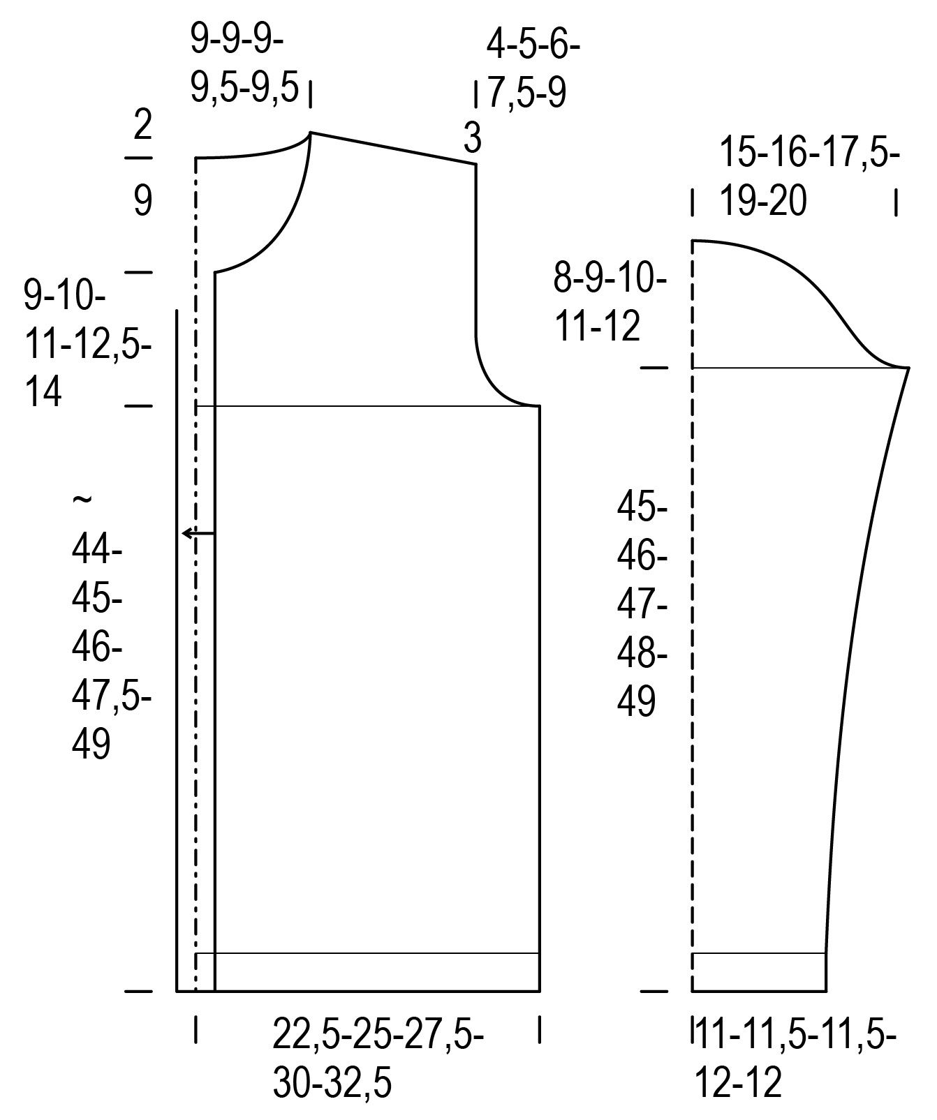 chest circumference 90(100)110(120)130 cm / 35½(39¼)43¼(47¼)51¼ in length 64(66)68(71)74 cm / 25¼(26)26¾(28)29¼ in inner sleeve length 45(46)47(48)49 cm / 17¾(18)18½(19)19¼ in