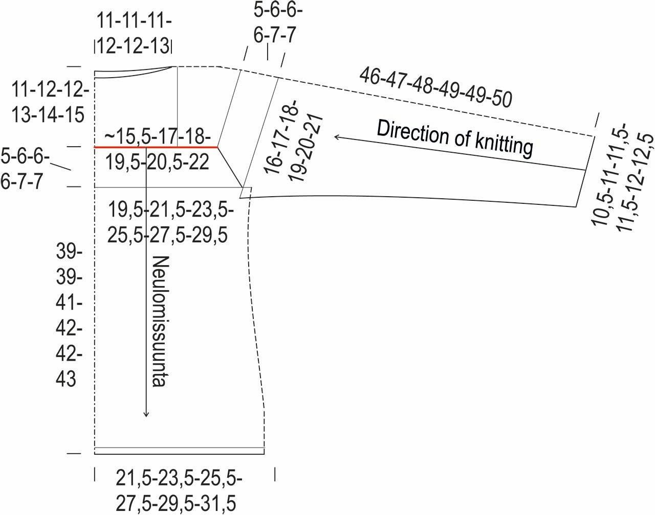 Body circumference 78(86)94(102)110(118) cm Length of the garment 55(57)59(61)63(65) cm Inner sleeve length 46(47)48(49)49(50) cm