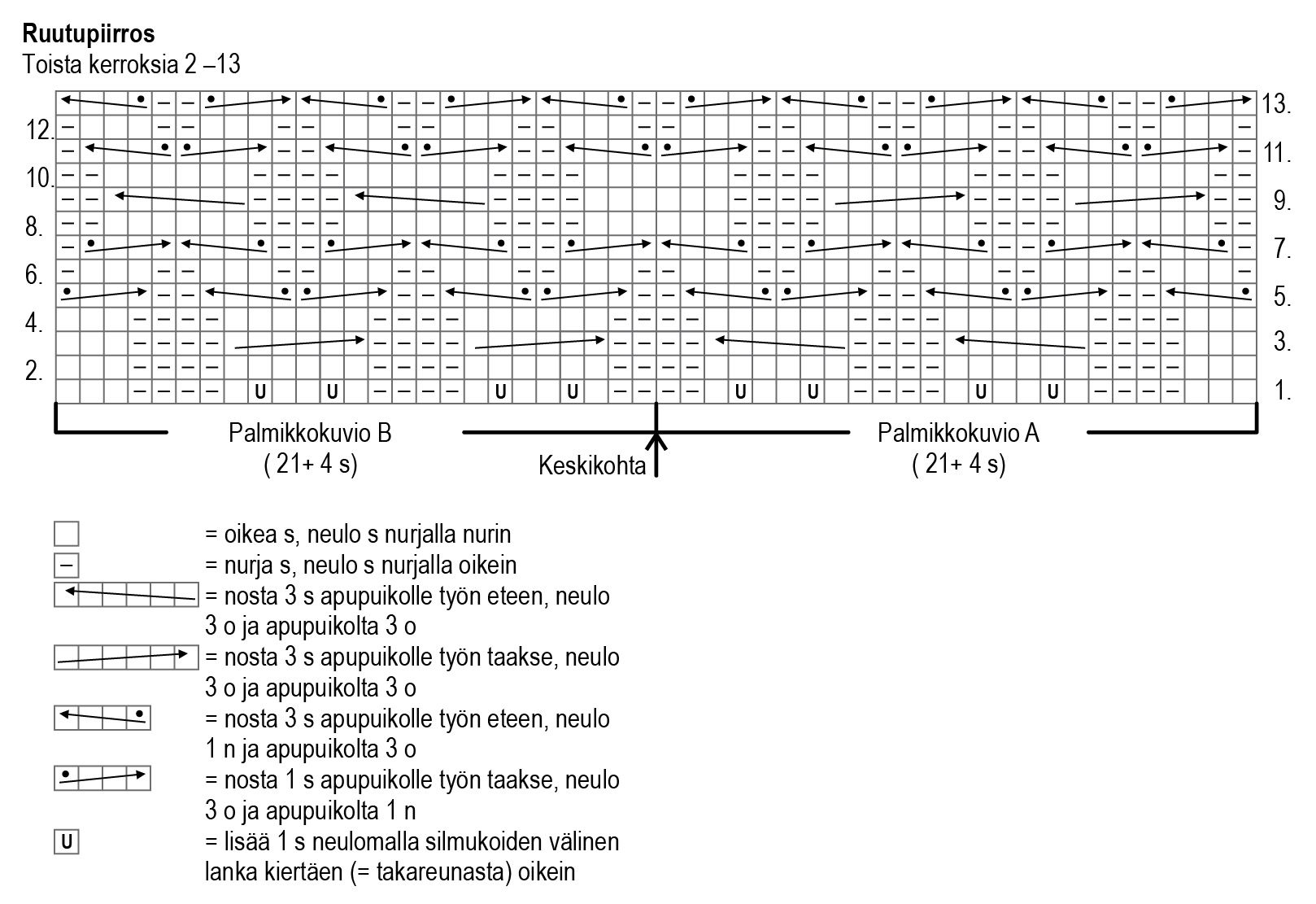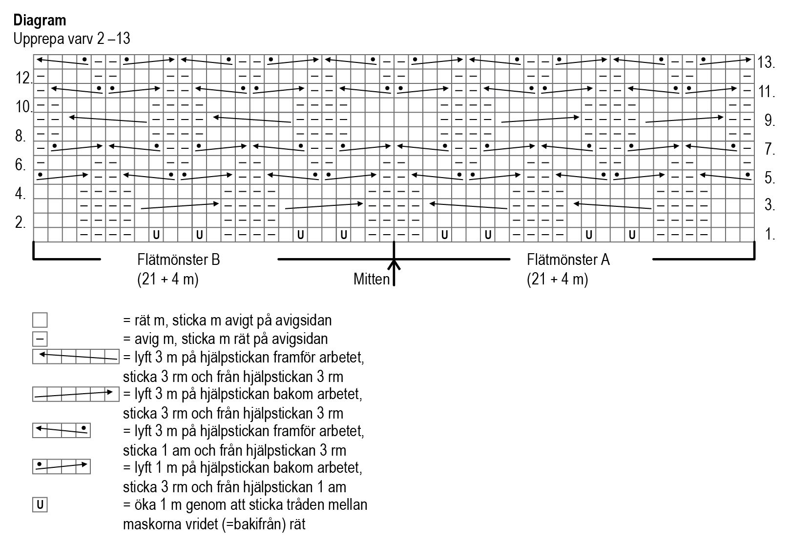 Note: When you have completed rows 2-13 of the chart once and have worked row 2 again, on the next row (row 3 of the chart) increase 1 st (= pick up the strand of yarn between the st you've just worked and the st you're about to work and knit it through the back loop) between cable patterns A and B, on both sides of the middle 4 purl sts. Mark the increase round using e.g. a piece of red yarn. Later on, remember to mark also the following increases made in between the cables. From now on the 2 sts between the cables will be worked in reverse stockinette st. Repeat the increases in the middle of the piece, on the edges of the cables every 3 cm for another 1(1)1(1)2(2) times. 4(4)4(4)6(6) sts in reverse stockinette between the cables.
