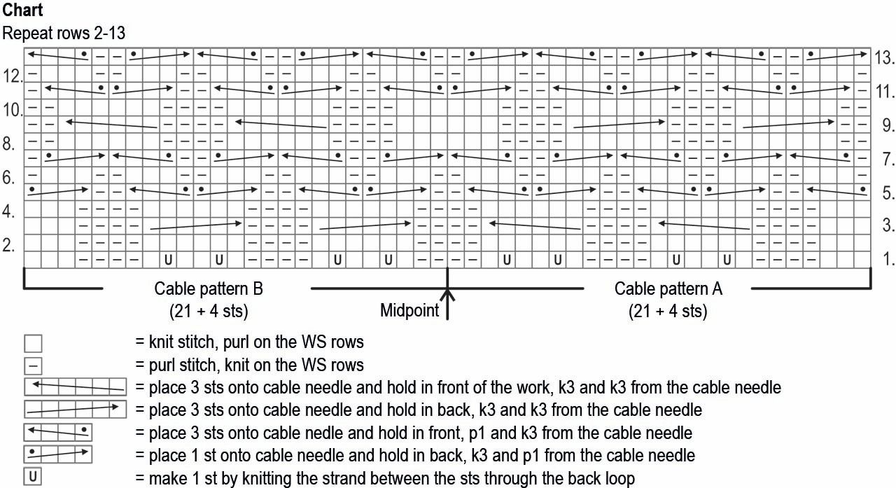 Begin the cable pattern from row 1 of the chart: work 5(6)7(7)8(9) sts in reverse stockinette st, work cable pattern A (21 sts + 4 sts) from the chart, work cable pattern B (21 sts + 4 sts) and then work 5(6)7(7)8(9) sts in reverse stockinette st. 8 sts increased on this row, 60(62)64(64)66(68) sts on the needles. On the cable, repeat rows 2-13 of the chart.