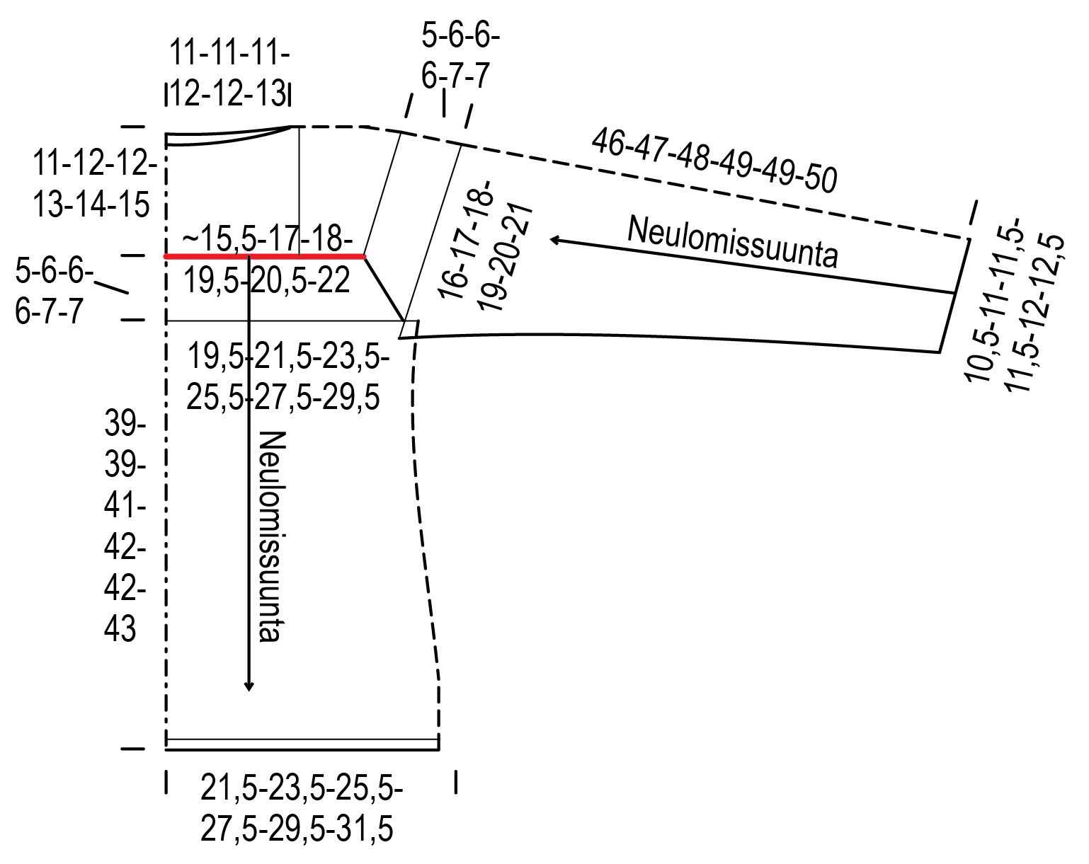 Pick up and knit 62(68)74(78)82(88) sts from the straight part of the back piece (marked with red onto the pattern), from the right side of the work. Work reverse stockinette stitch flat and increase on every 2nd row on both ends of the piece 7(8)8(8)9(9)x1 st = 76(84)90(94)100(106) sts. Leave the sts on hold e.g. on a piece of yarn.