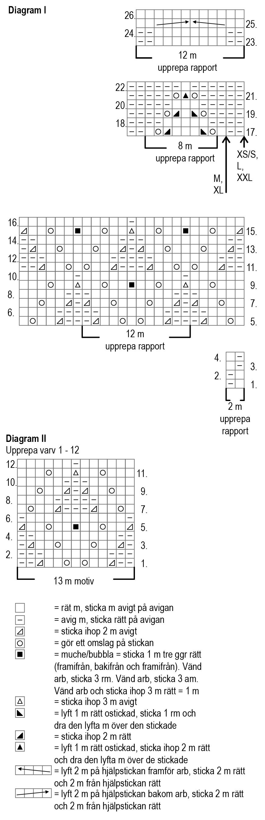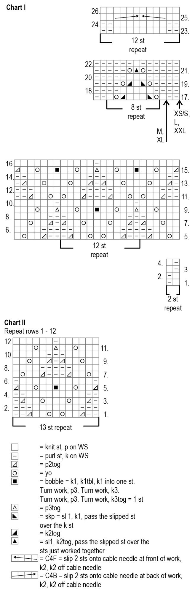 Continue working in textured stitch pattern. Start from row 23 of chart I and repeat the 12 stitch pattern for 9 (10) 11 (12) 13 times. Keep repeating rows 23-26.