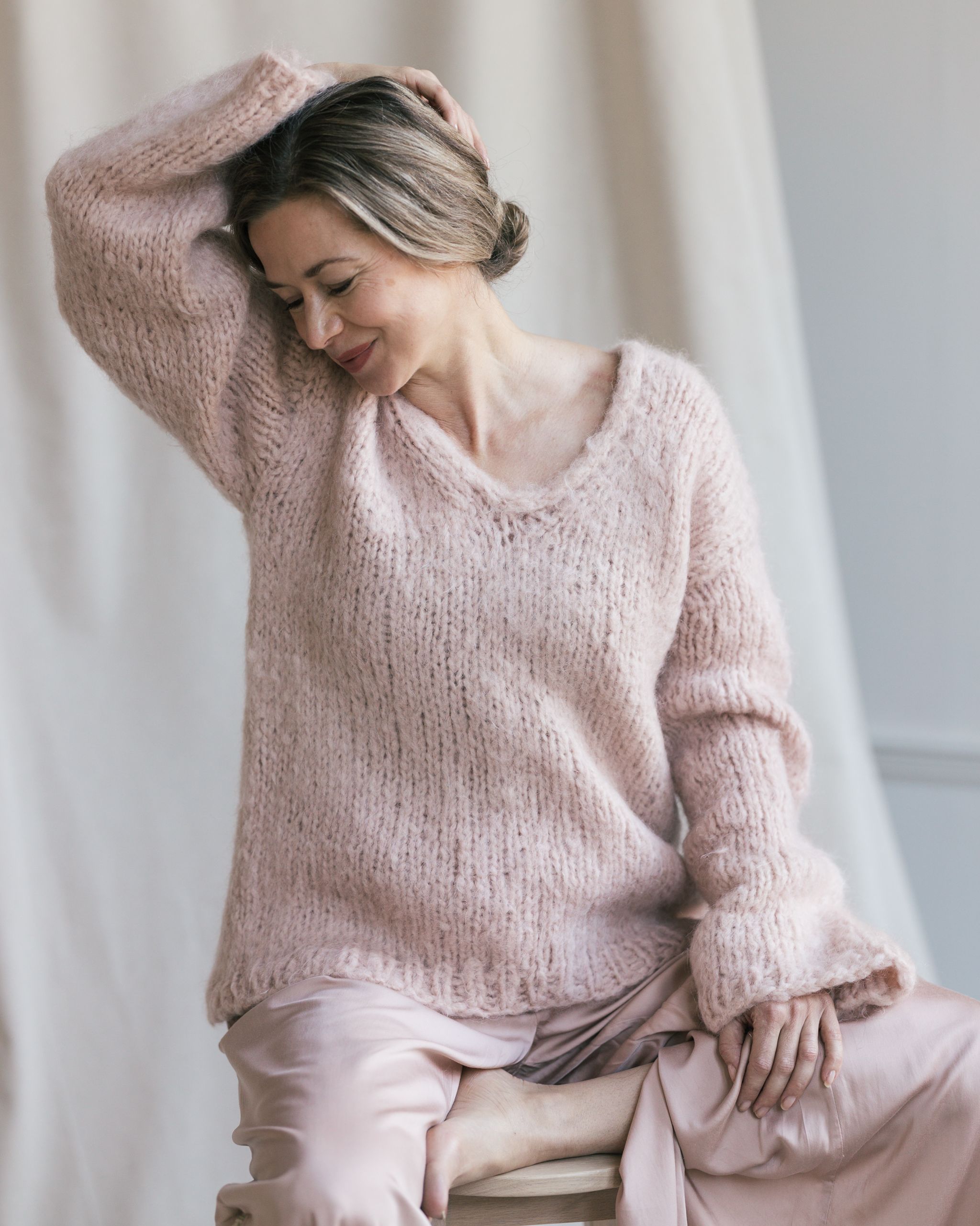 Luja-neulepusero neulotaan saumattomasti ylhäältä alas Novita Ateljee -langalla. Yksinkertaisen tyylikkään neuleen yksityiskohta on takakappaleen olalle sijoittuva eurooppalainen olkalinja. Pusero neulotaan suljettuna neuleena kädentieltä helmaan ja hihat neulotaan saumattomasti ylhäältä alas kädentieltä langan avulla poimituilla silmukoilla.