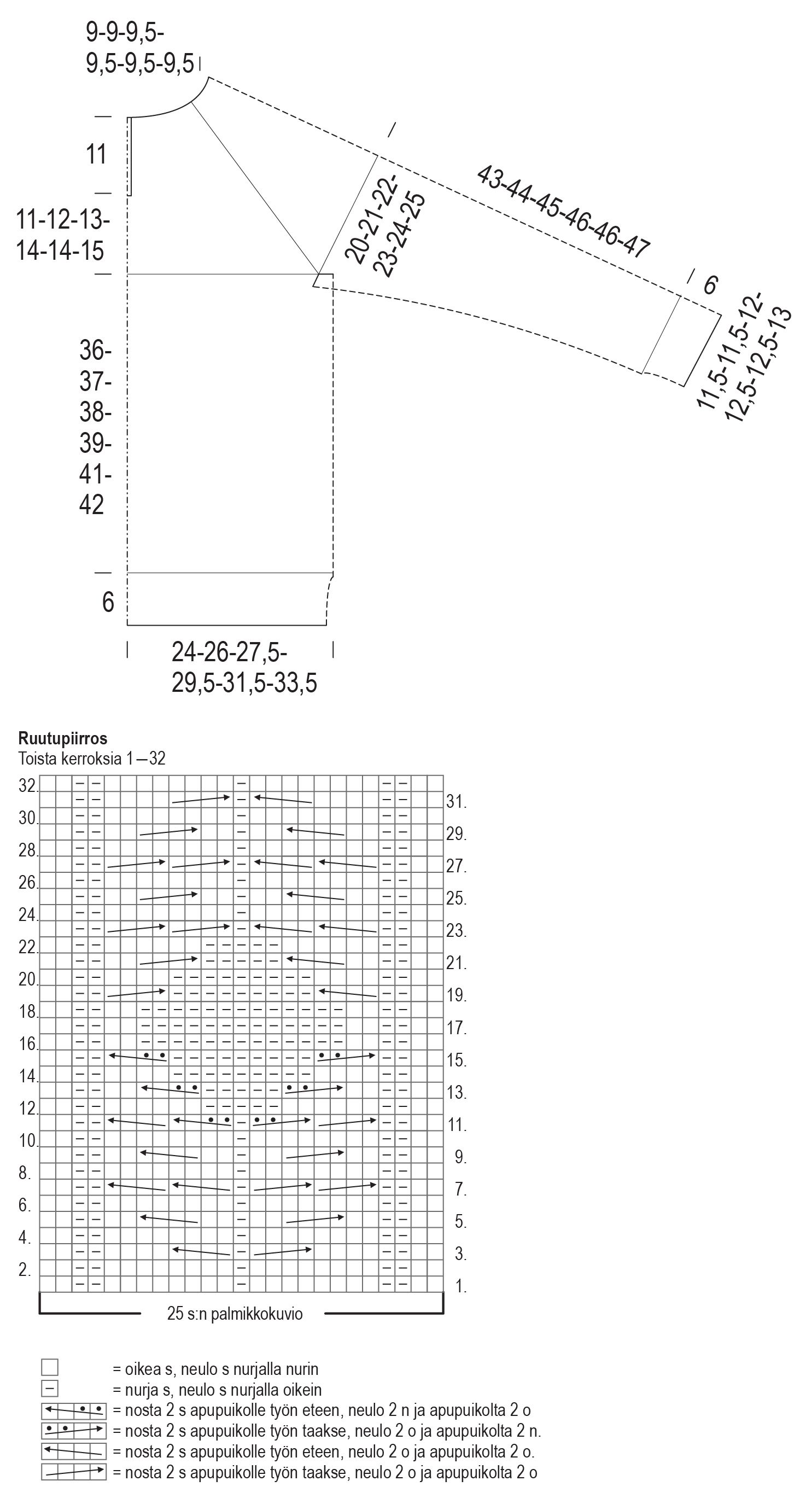 Vaihda työhön paksummat pyöröpuikot ja aloita pidennetty helmineule sekä palmikkokuvio edessä ja takana ruutupiirroksen 1. kerrokselta: *neulo 33(38)42(47)52(57) s:lla pidennettyä helmineuletta, toista 25 s:n palmikkokuvio 3 kertaa (= 75 s), neulo 33(38)42(47)52(57) s:lla pidennettyä helmineuletta*, lisää silmukkamerkki (kappaleen sivu) ja toista *–*. Neulo palmikossa ruutupiirroksen kerrokset 2–32 ja toista sitten kerroksia 1–32.