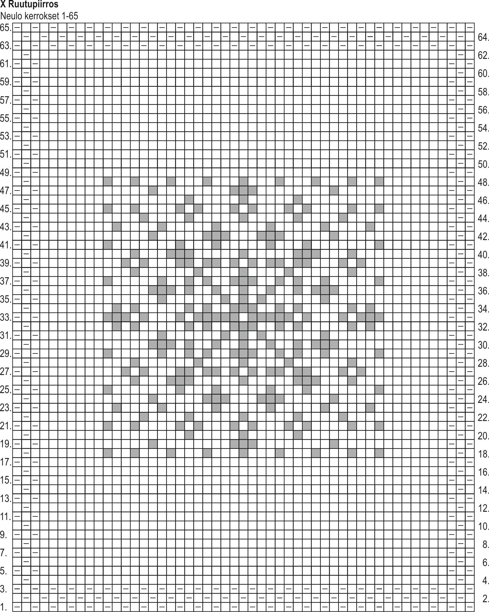 Aloita tähtikuvio 14. kerrokselta ja neulo vielä ruutupiirroksen kerrokset 15–52.