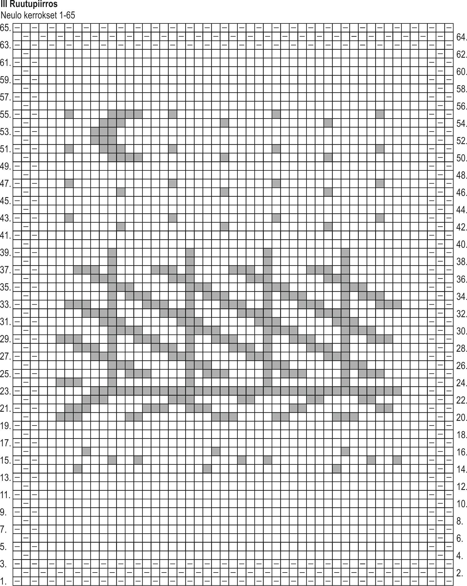 Aloita lumikuvio 18. kerrokselta ja neulo vielä ruutupiirroksen kerrokset 19–48.