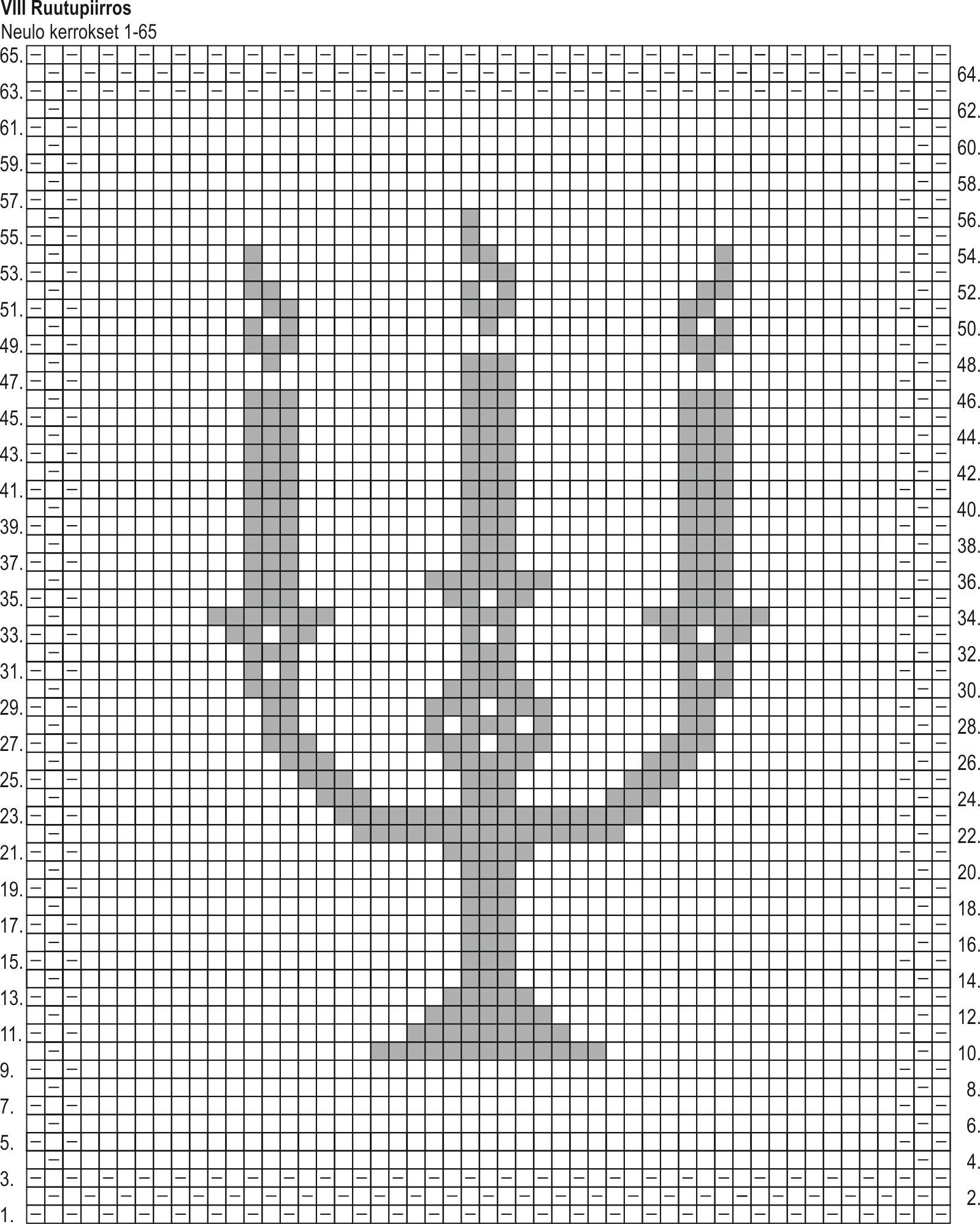 Aloita kynttelikkökuvio 10. kerrokselta ja neulo vielä ruutupiirroksen kerrokset 11–56.